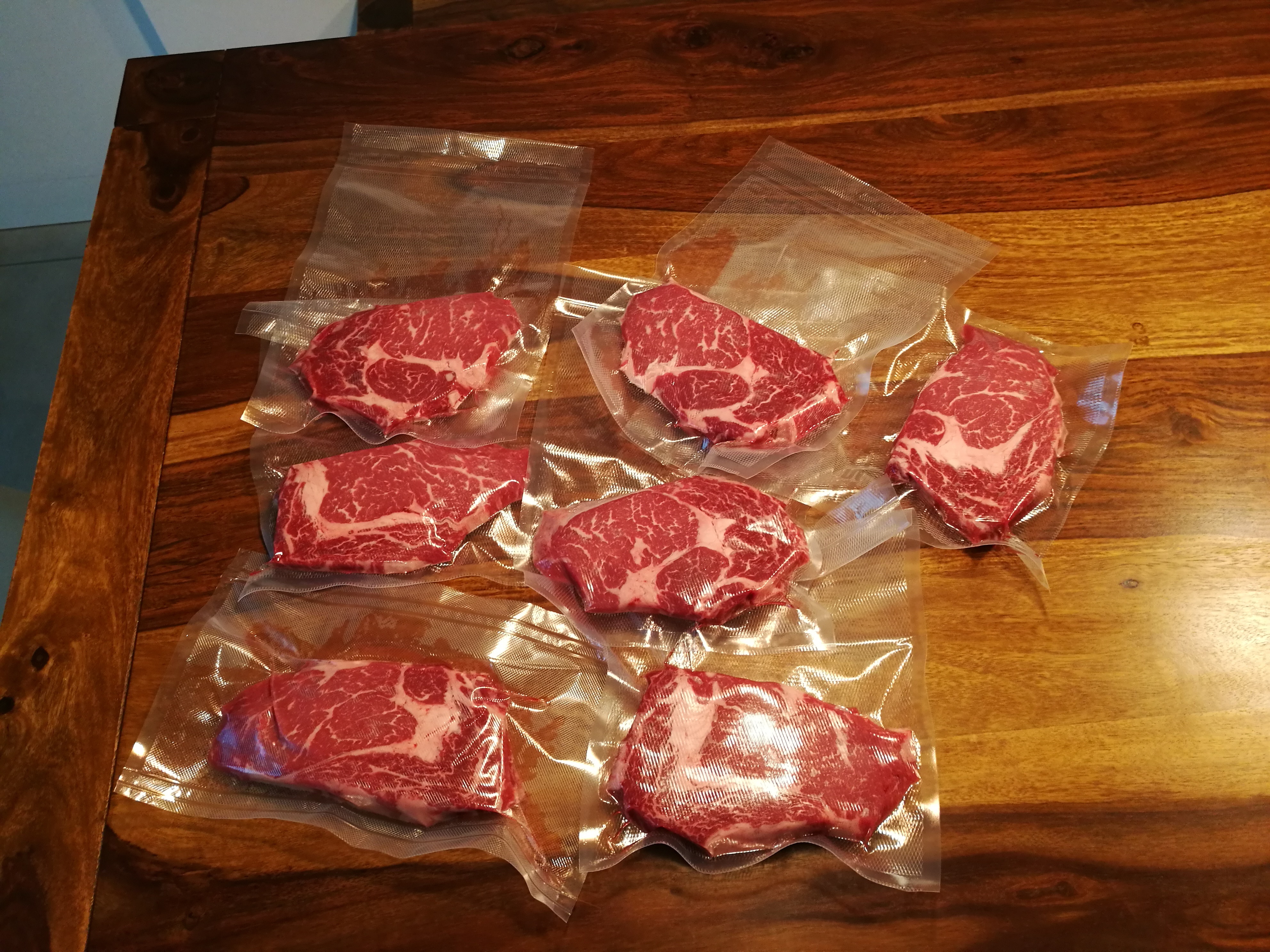 nachdem ich hier letztens das argentinische Entrcote von der Metro empfohlen habe, wollte ich euch auch mal ein paar Bilder davon zeigen. War ein Stück von ca. 2.5kg und wurde in 8 Steaks plus Anschnittrest portioniert.