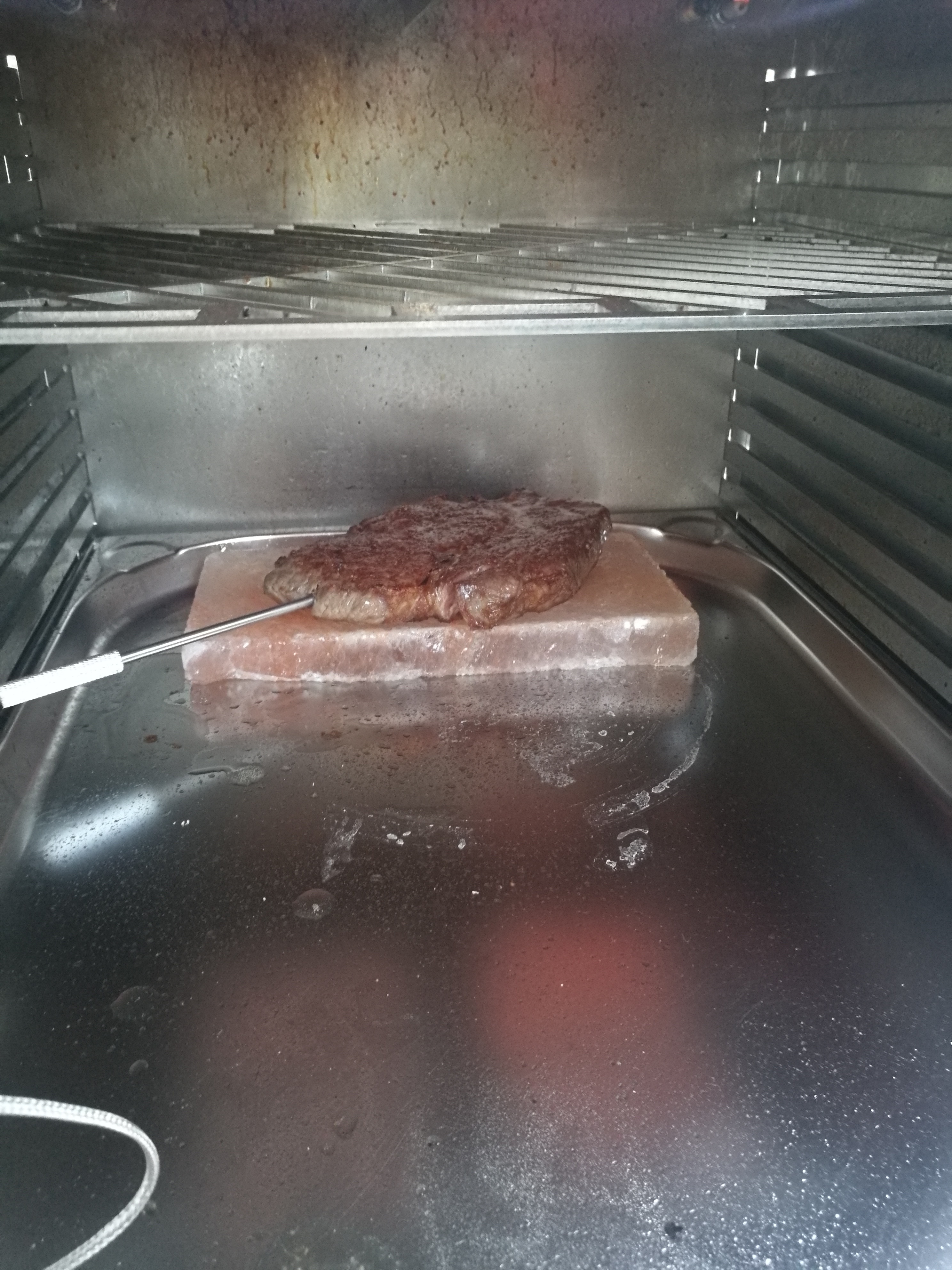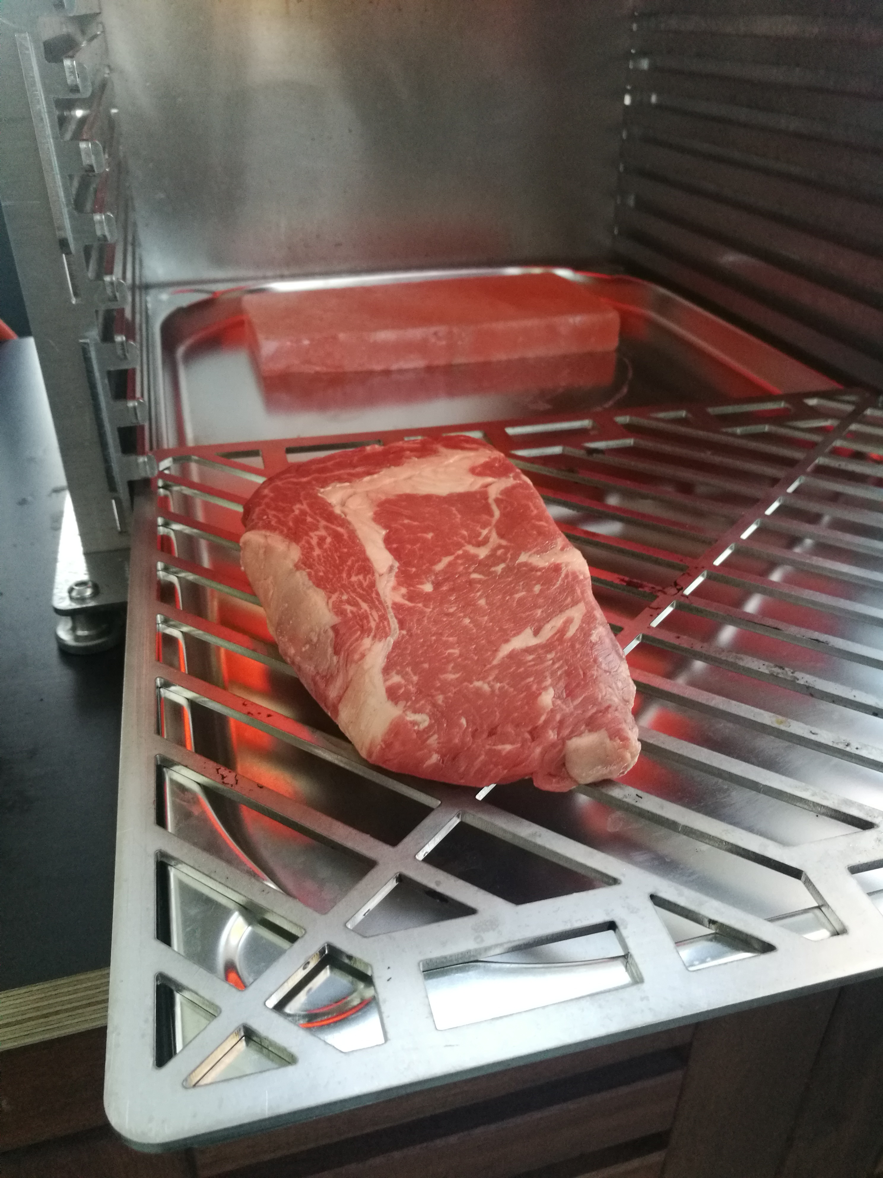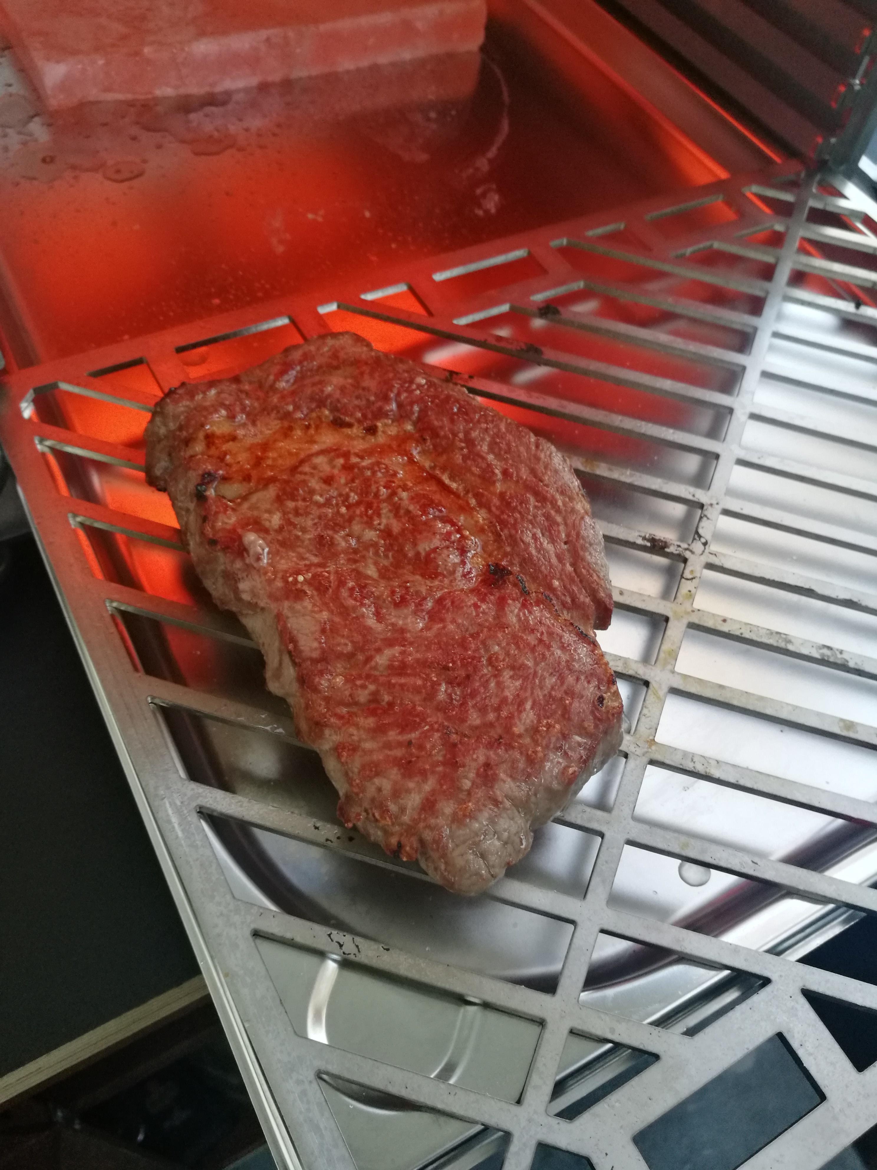 Geschmacklich ist mir jetzt nicht direkt was aufgefallen, aber was man glaub ich auch auf den Fotos sieht: Das Fleisch ist sehr gleichmäßig nachgezogen. Brenner auf kleinster Stufe von oben, Salzstein wärmt von unten, Prinzip Pizzastein light.