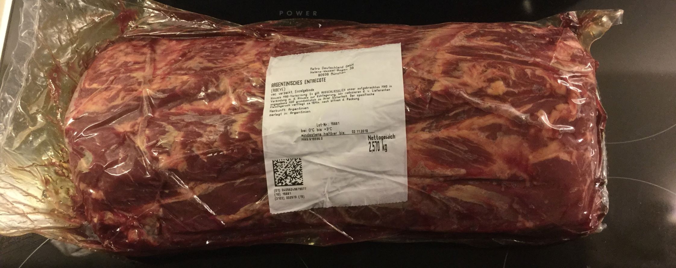 Bin seit gestern auch Metro-Karten-Inhaber und war in den heiligen Fleischhallen. Habe vermutlich das gleiche Entrecote gestern im Angebot gekauft (Kilo für 12,49 € netto, also 13,56 € brutto). Daheim dann gleich in 4cm Stücke zersäbelt, vakuumiert und gefrostet.