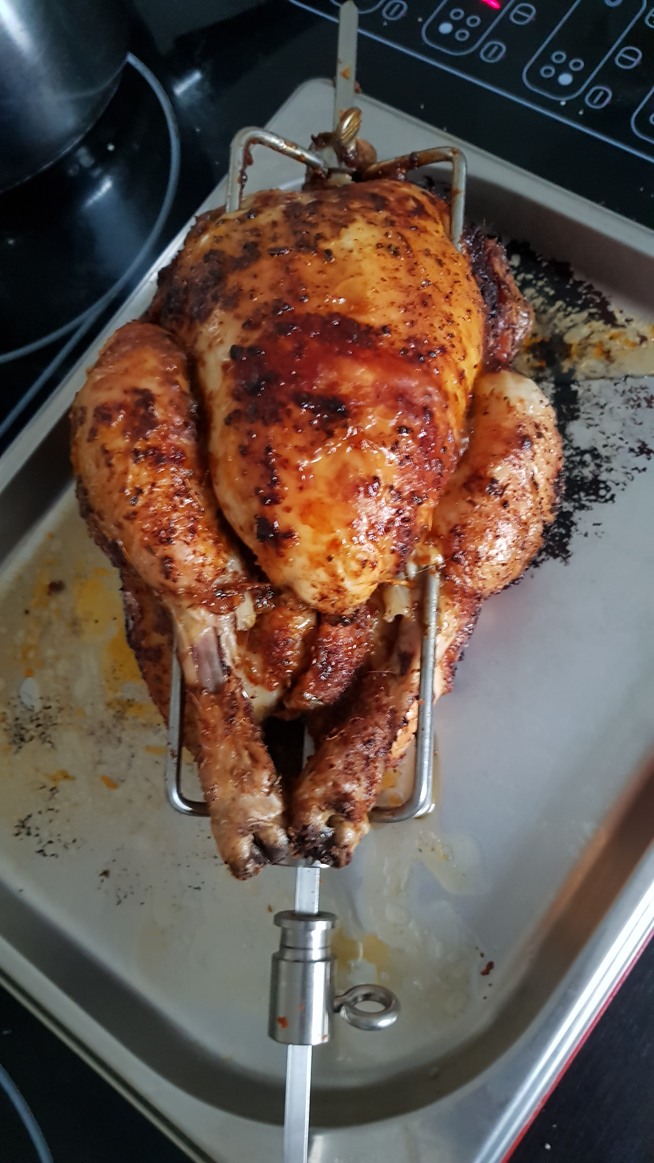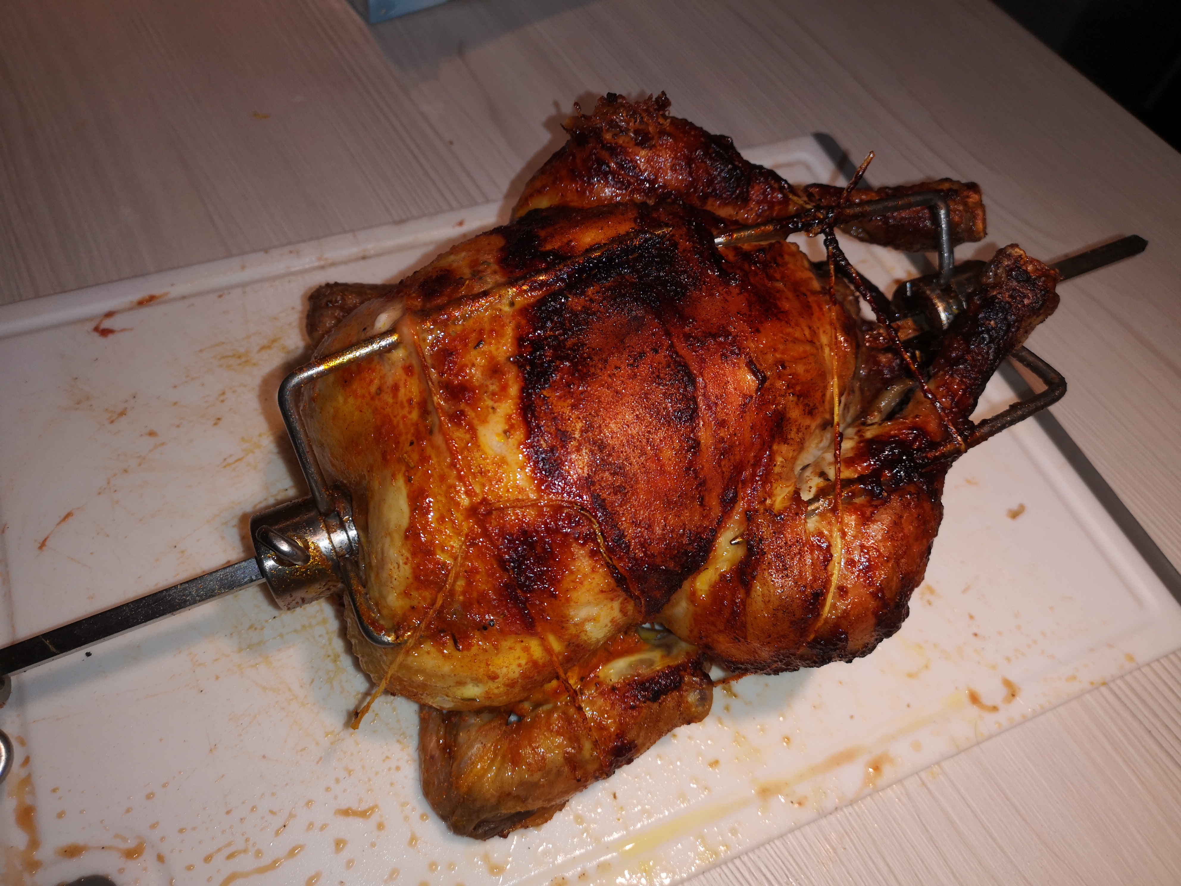 Das fängt mit etwas Eigenarbeit an, d.h. das Huhn einölen, Hähnchen-Rub drauf, zentrisch auf den kurzen Drehspieß hinten fixieren, die abstehende Extremitäten schnüren und in die vorbereitete neue Phönix-/Evo3 Kombi App (Prototyp) einlegen: