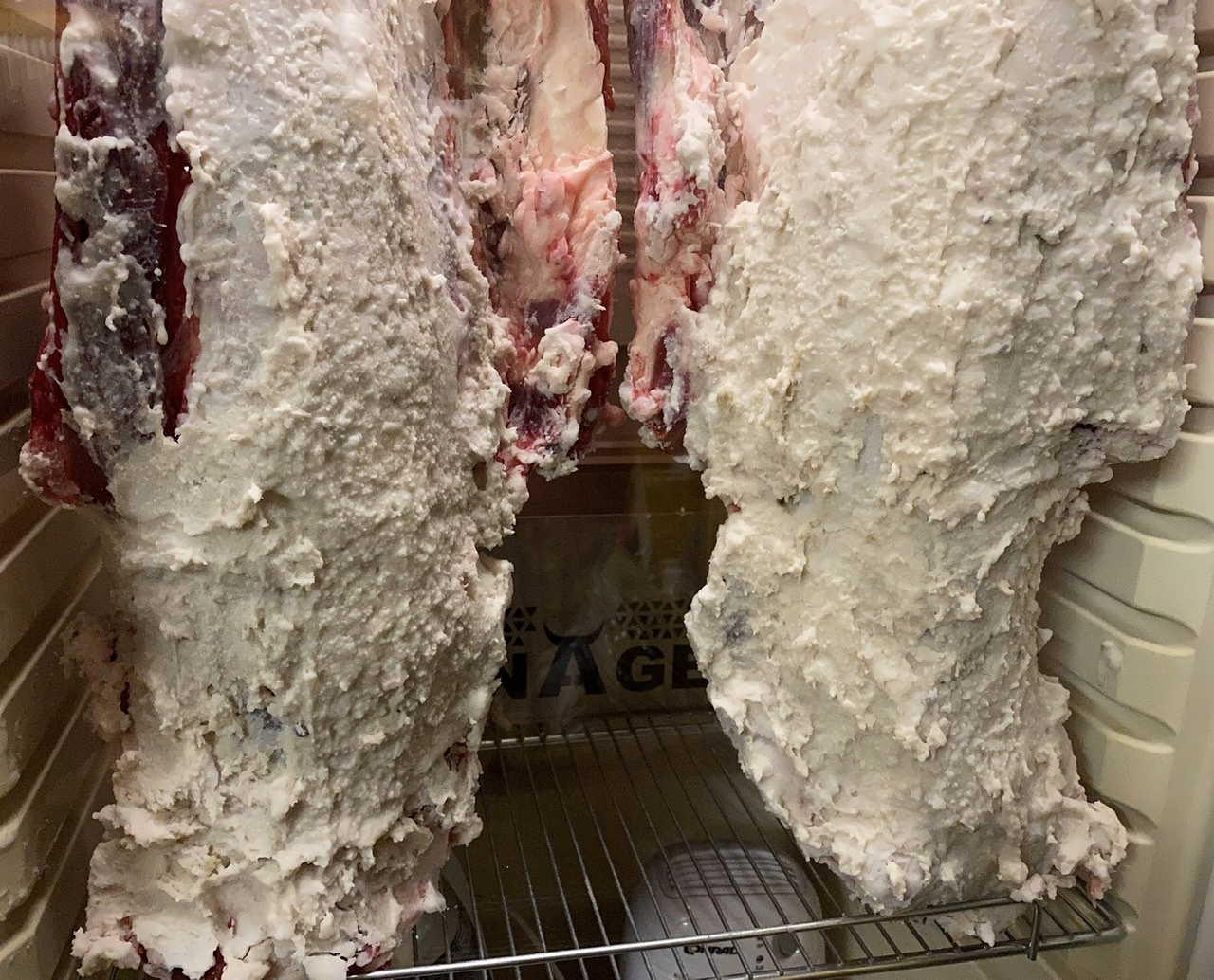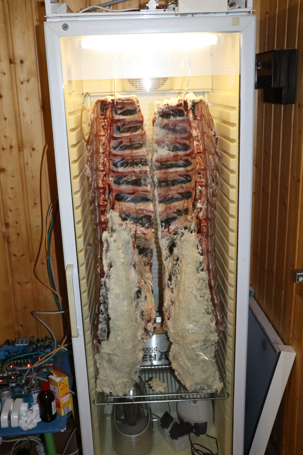 Vor zwei Wochen war es so weit. Das Fleisch war 8 Wochen im Schrank und wir sind zur Tat geschritten und haben es zerlegt.
