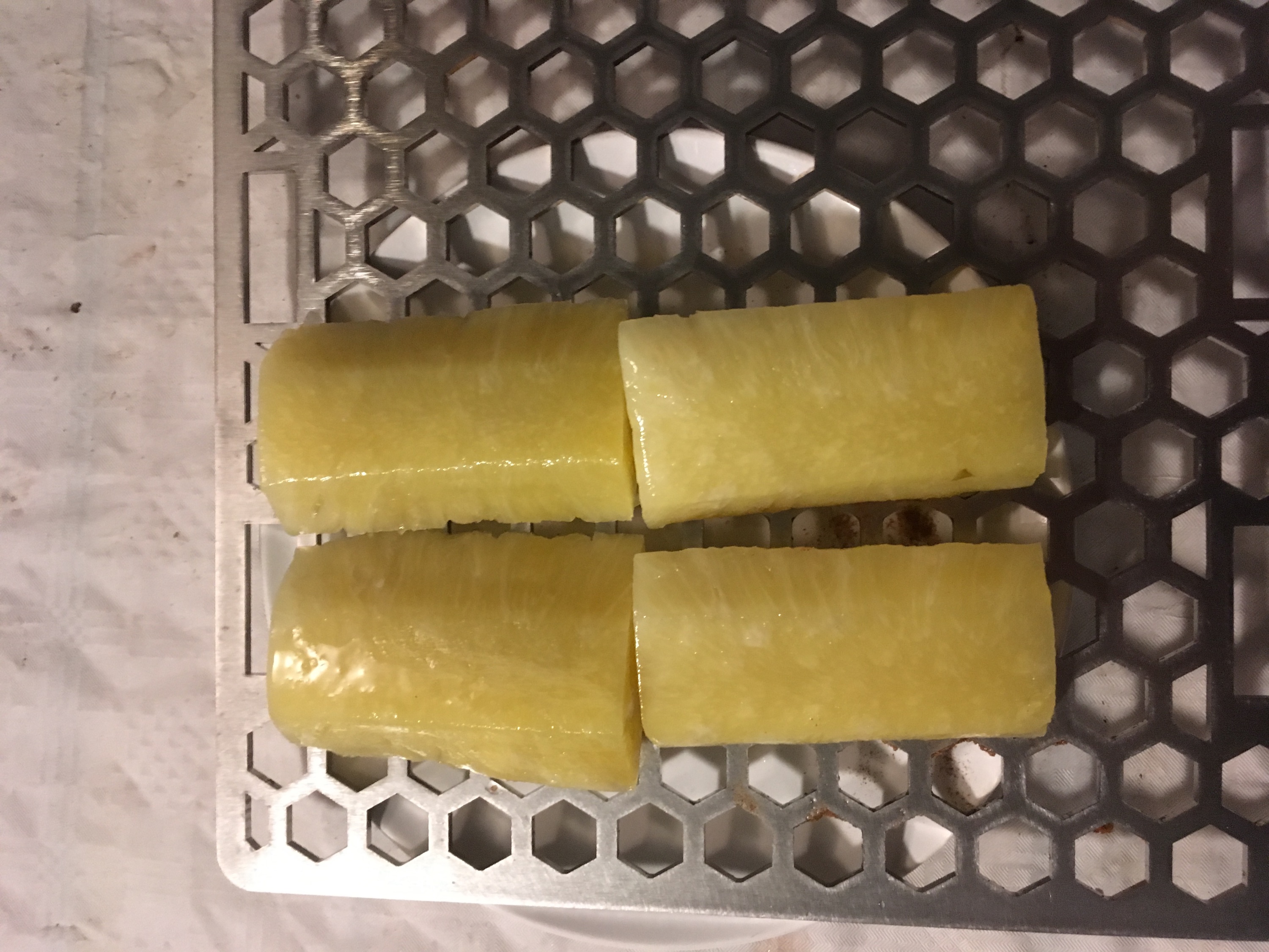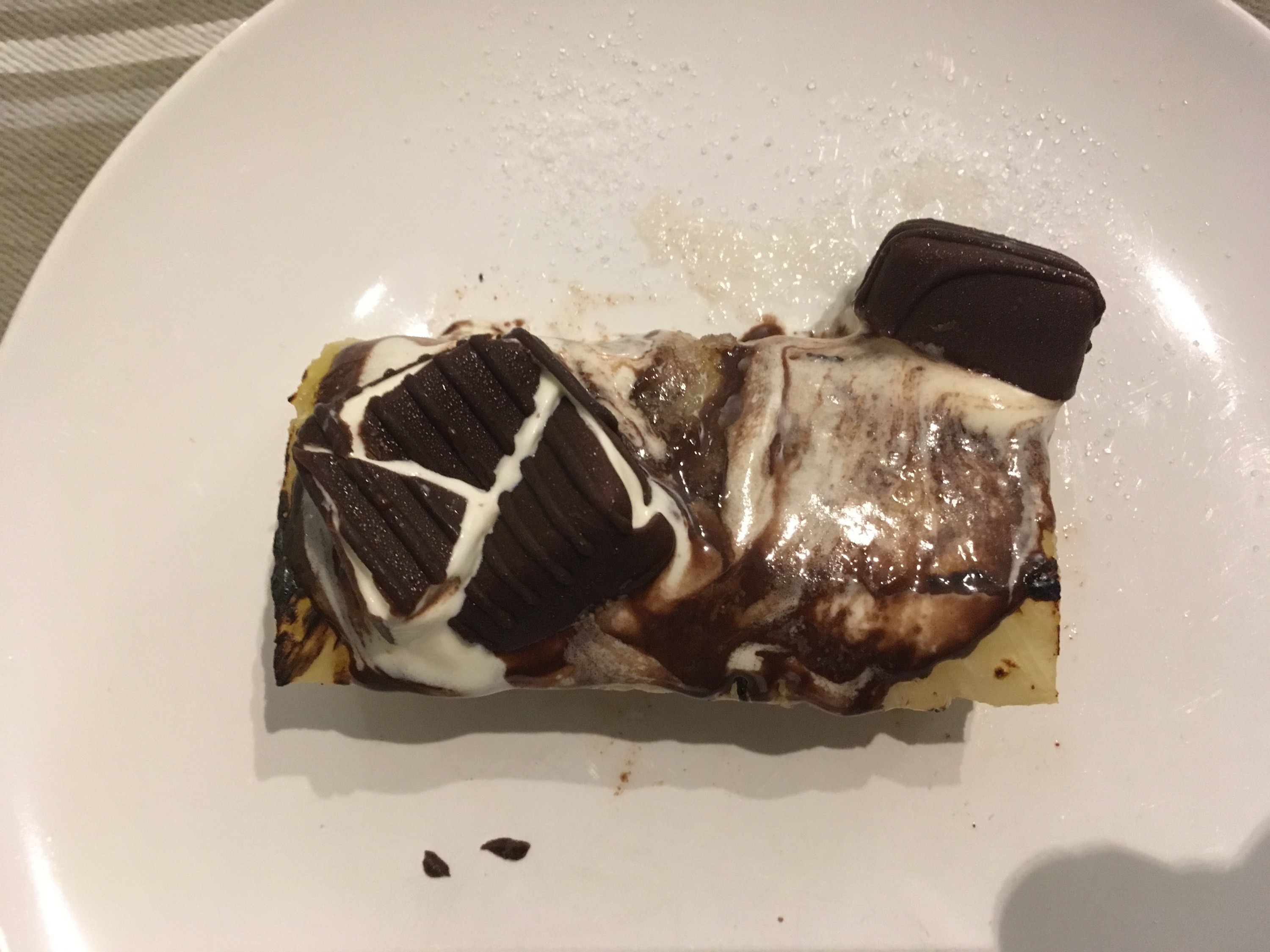 Ananas vierteln und die Filets rausschneiden. Dann schön vakuumieren. Denke hier kann mit Butter und oder Vanille gearbeitet werden. 85 Grad für 60 Minuten. Dann rauspacken, aufs Rost.... mit braunem Zucker bestreuen und für 40 - 60 Sekunden in die dritte Schiene des OHG.