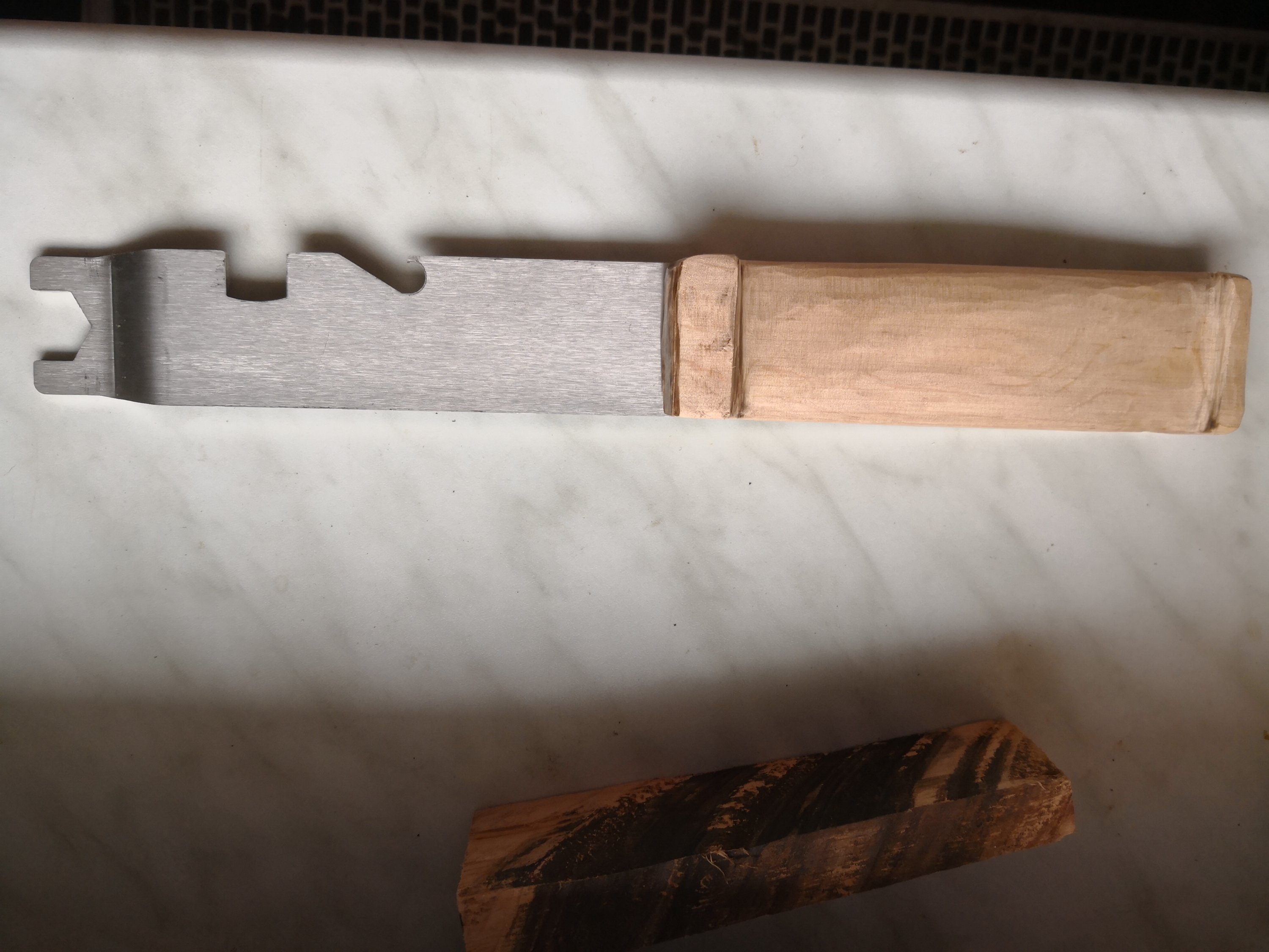 Wenn es soweit fertig ist, müssten beide Teile erst mal angehalten werden, wie das in der Hand liegt. Ggf. dann noch mehr wegnehmen, sonst wird der Griff zu breit.