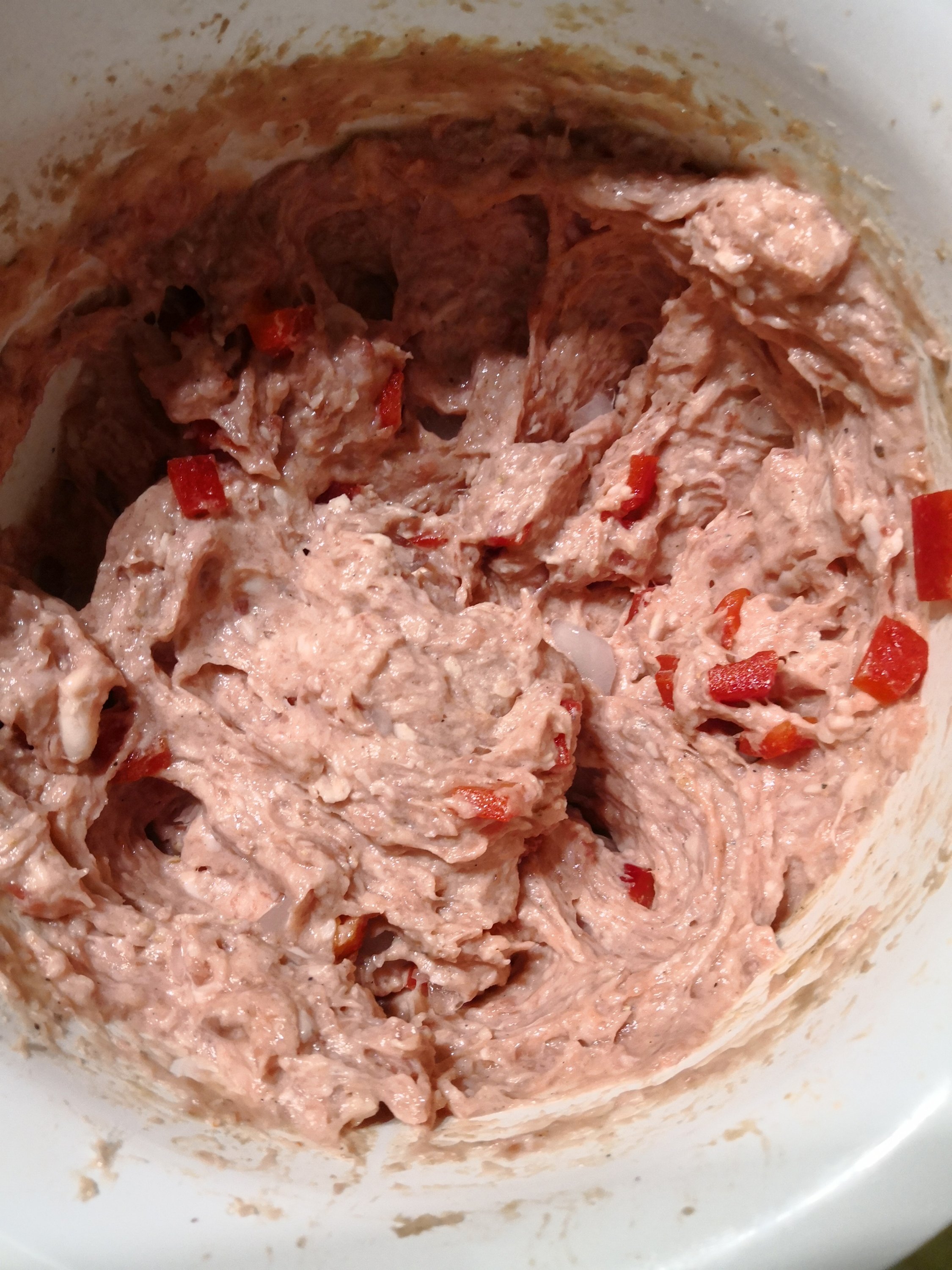 Brät, Gewürze und den Eisschnee zunächst grob von Hand mengen. Paprikawürfel von Hand unterheben und dann in der Küchenmaschine mit dem Knethaken erst bei niedriger und dann höherer Stufe 15 Minuten gut vermengen, bis das Brät schön klebrig ist.