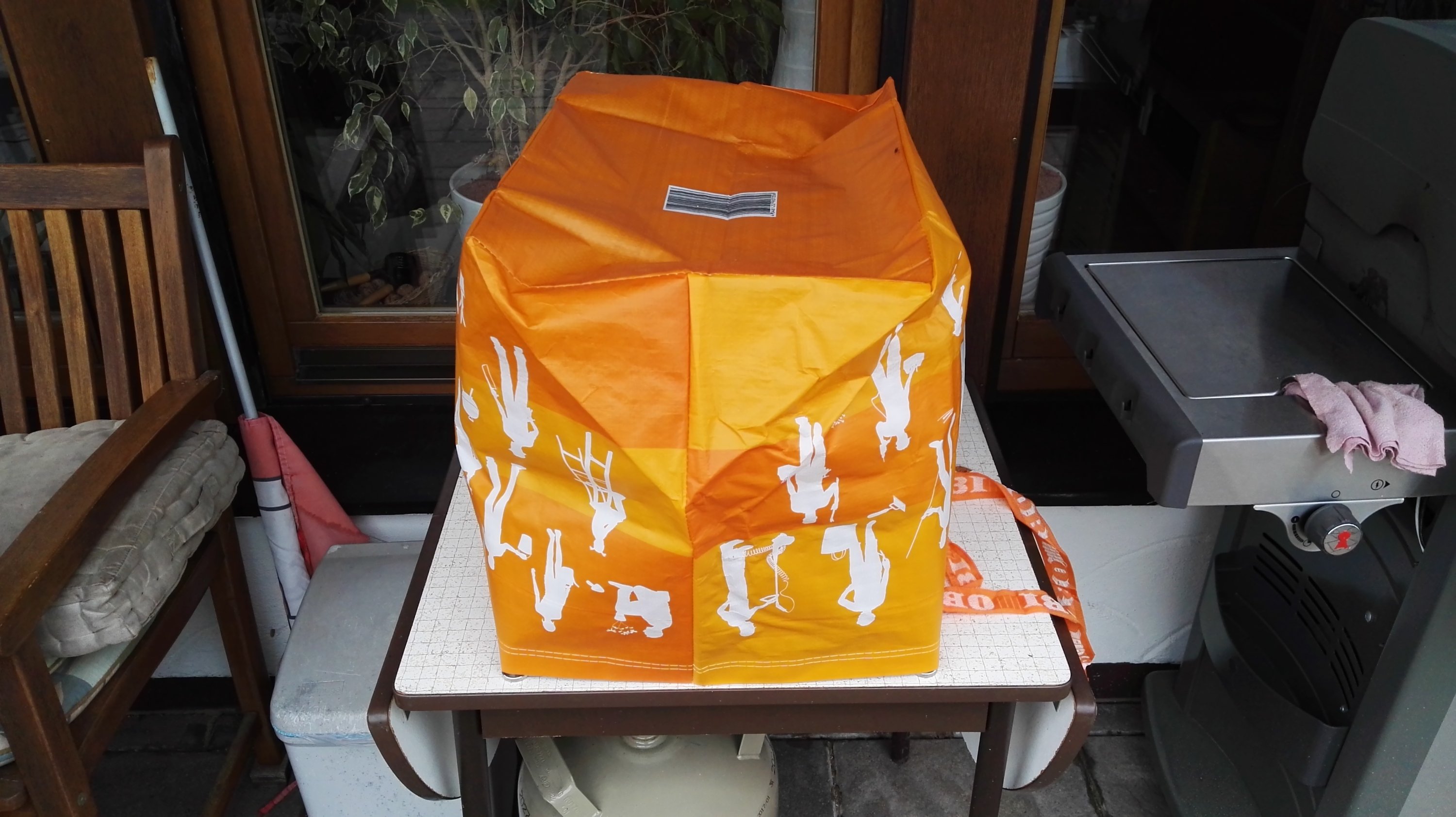 Falls noch jemand nach eine günstigen Variante für eine Abdeckung für den Twin sucht, ich hätte da einen Vorschlag. Wasserdicht ist das sicherlich an den Nähten nicht, aber vor Staub, Schmutz und Feuchtigkeit schützt das sicherlich. Wer basteln mag kann sich in den Saum an der Öffnung auch eine Kordel einfädeln, dann kann man das Ganze auch festzurren. Ich klemme einfach nur die Henkel unter die Füße vom Twin, hält auch.