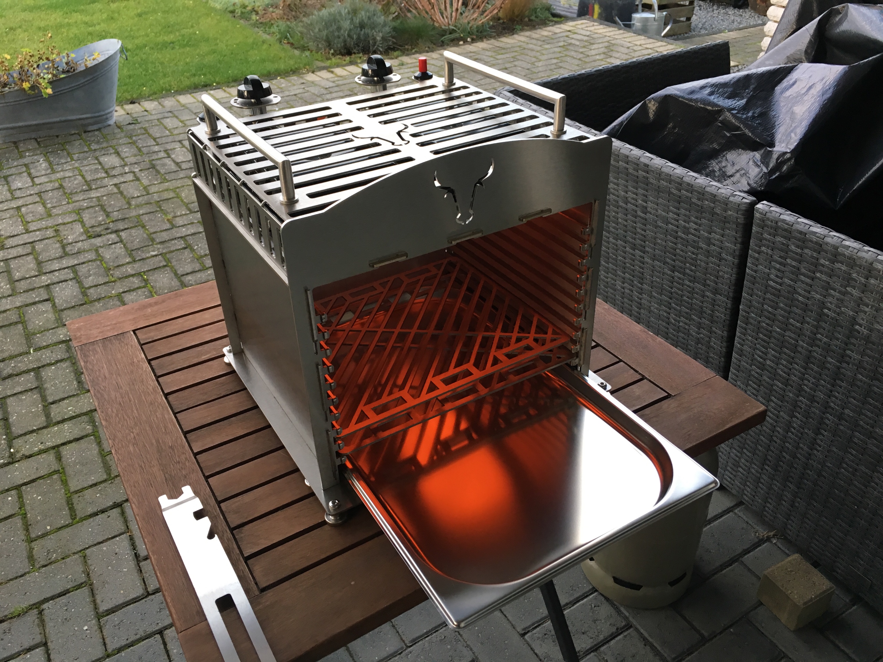 Soulflyer hat geschrieben: Mi 4. Apr 2018, 17:02 habe mir für die schale zum warmhalten aus dem alten rothenberger gitter vom brenner nen kleinen rost gebaut damit die steaks nicht im eigenen saft liegen beim warmhalten.
