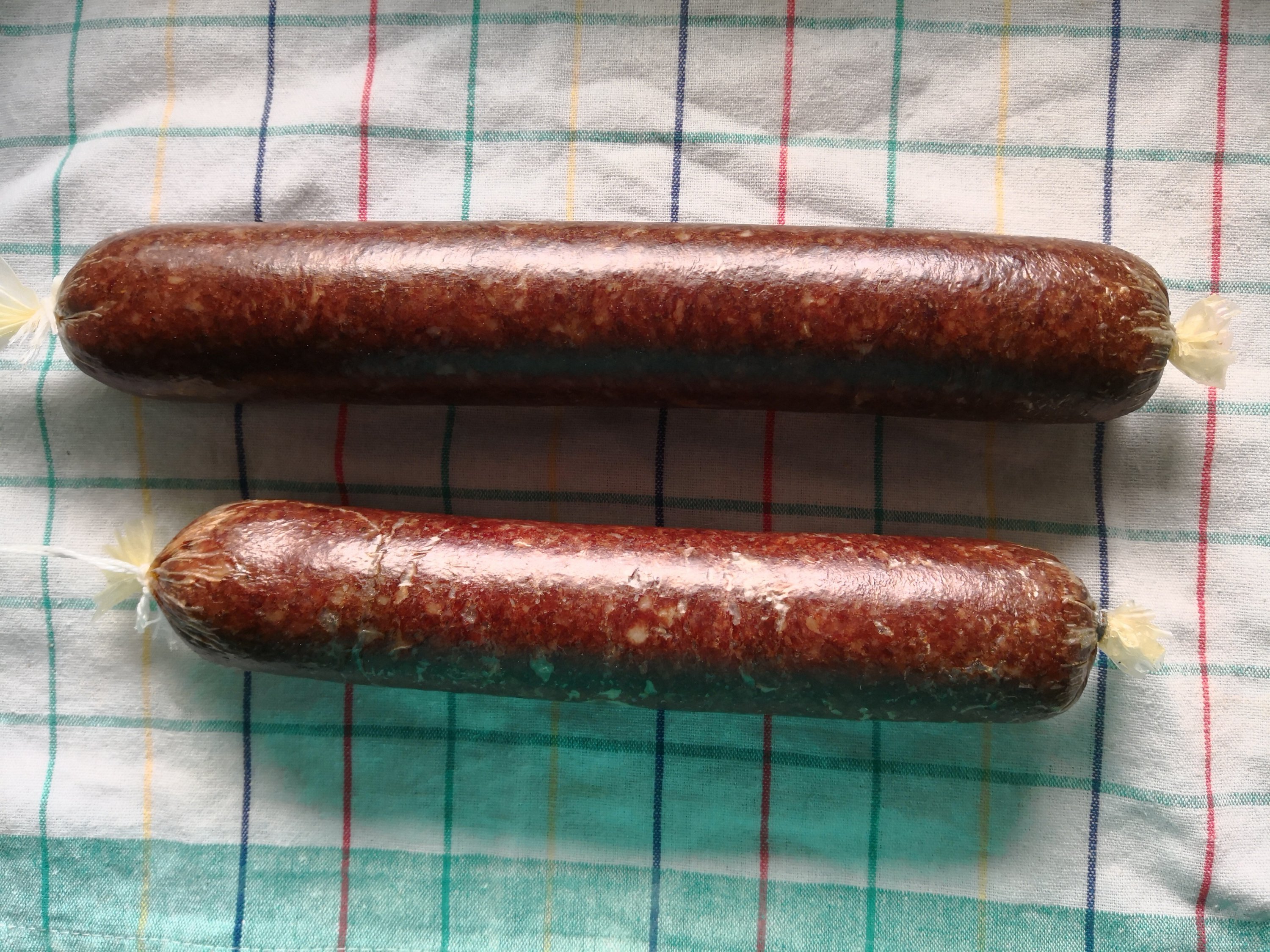 Die große Wurst hat bei ca. 400 g 30% an Gewicht verloren, die kleine sollte bei 320 g fertig sein.