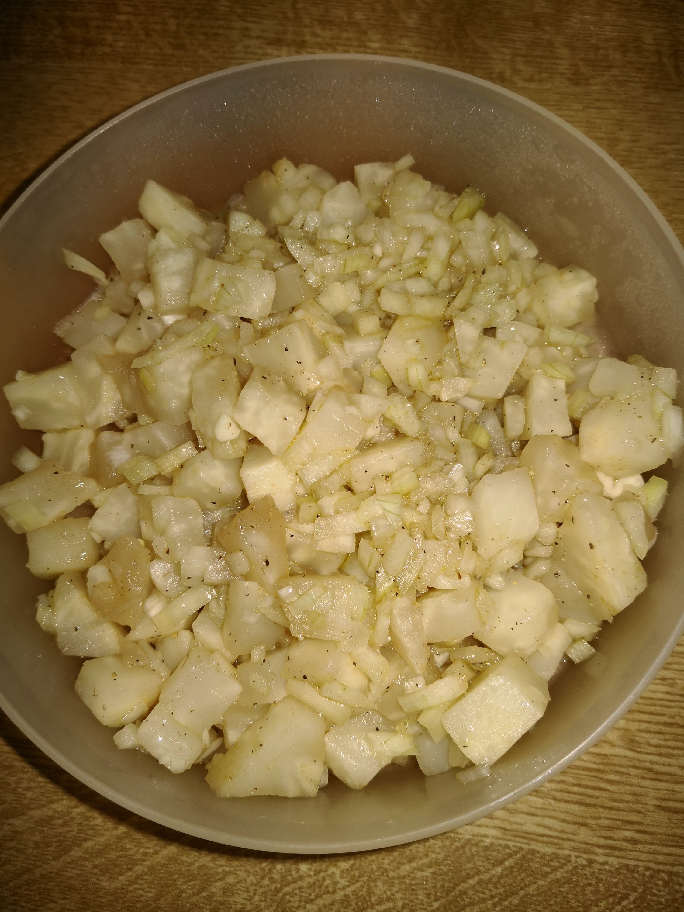 Ein kleiner Kopf Sellerie, eine große Zwiebel, Salz, Pfeffer, Essig, Öl