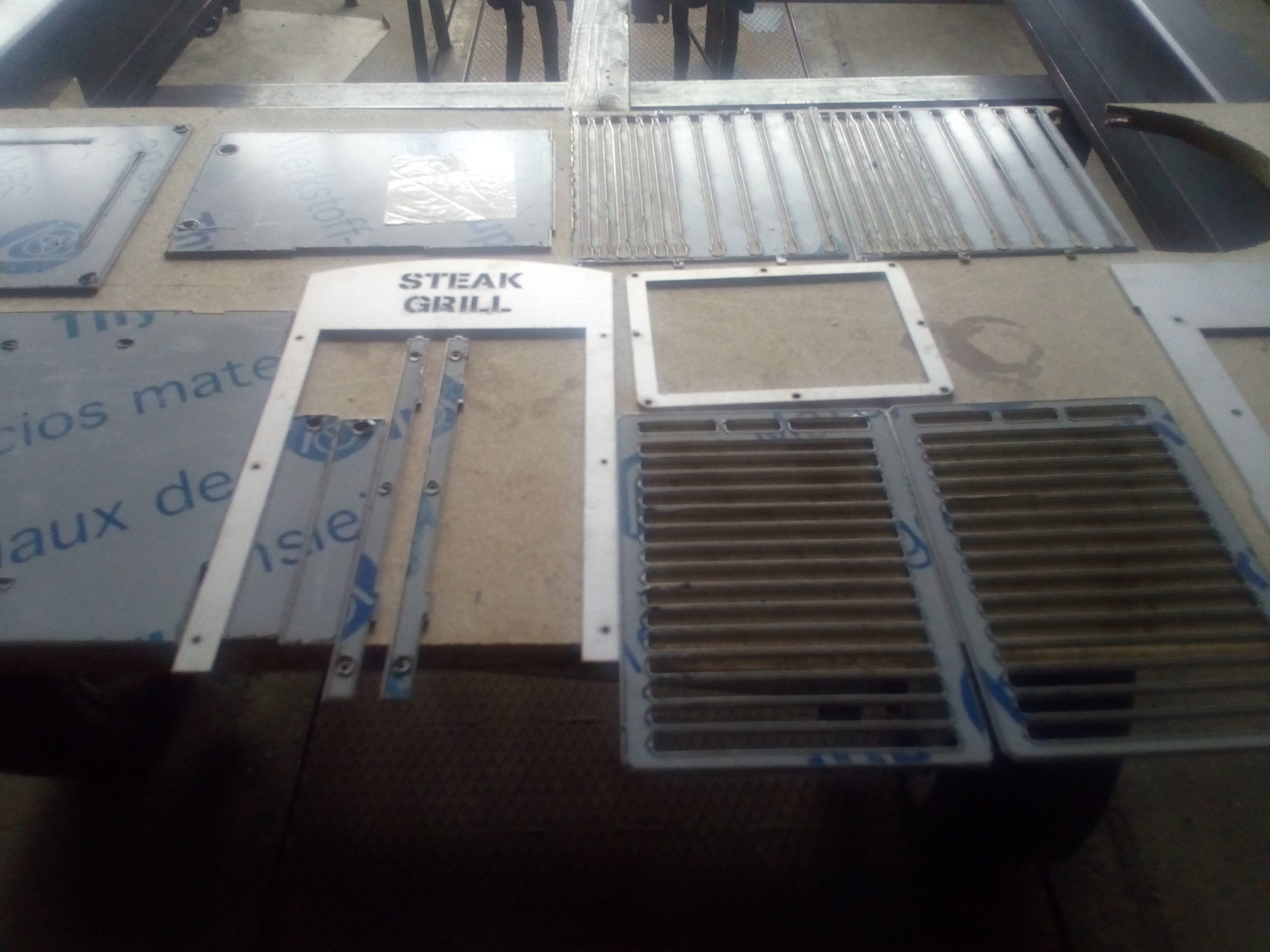 Die schmalen langen Teile neben der Front mit der „Steak Grill“ Schrift werden vor den Seitenwänden eingesteckt, die Front dran geschraubt. Ganz rechts liegt die obere Platte, links davon das Zwischenblech (zwischen Brenner und obere Platte kommt das) und darunter 2 Roste. Die Teile rechts oben habe ich nicht, sieht aus wie Einschübe fürs Rost. Die breiten länglichen Teile bei der Front sind Rostheber.