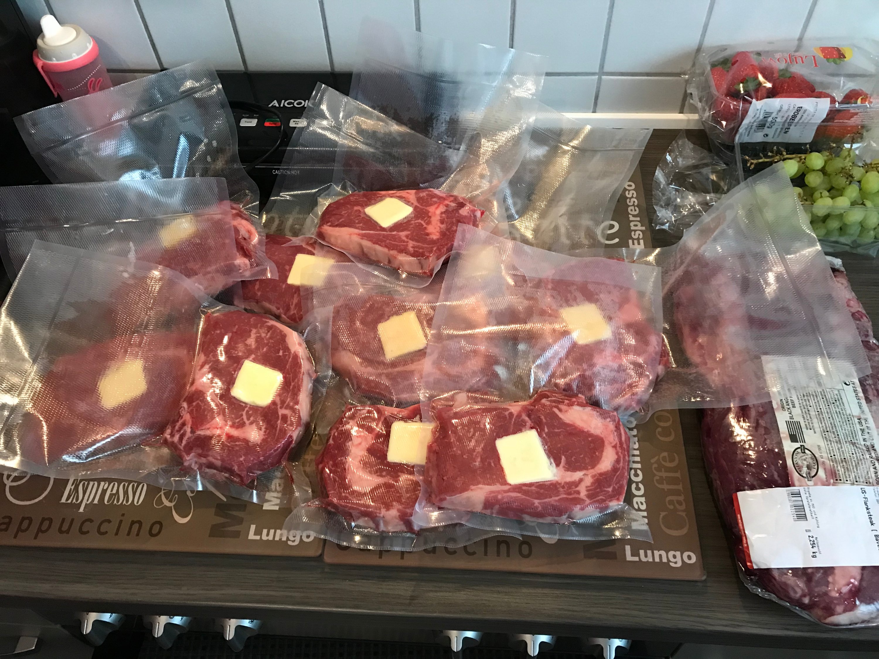Aktuell befindet sich das schöne Stück Fleisch im, vom Wancle-Stick auf 54 Grad temperierten, GN-Behälter bis ich es so ca. 23:00 Uhr aus dem Vakuum befreien und auf den Twin legen werde.