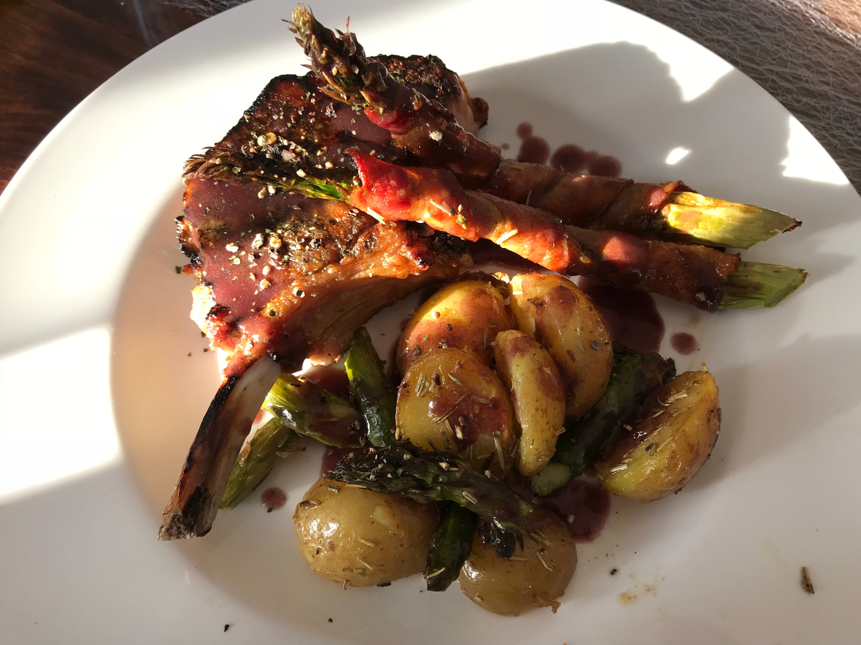 Dann zunächst 2x 1 Minute pro Seite bei Vollgas und Rost soweit oben wie möglich (3. Schiene) und anschließend unten bei niedrigster Gasstellung noch ca. 4-5 Minuten gar gezogen bis eine Kerntemperatur von 56 Grad erreicht war.