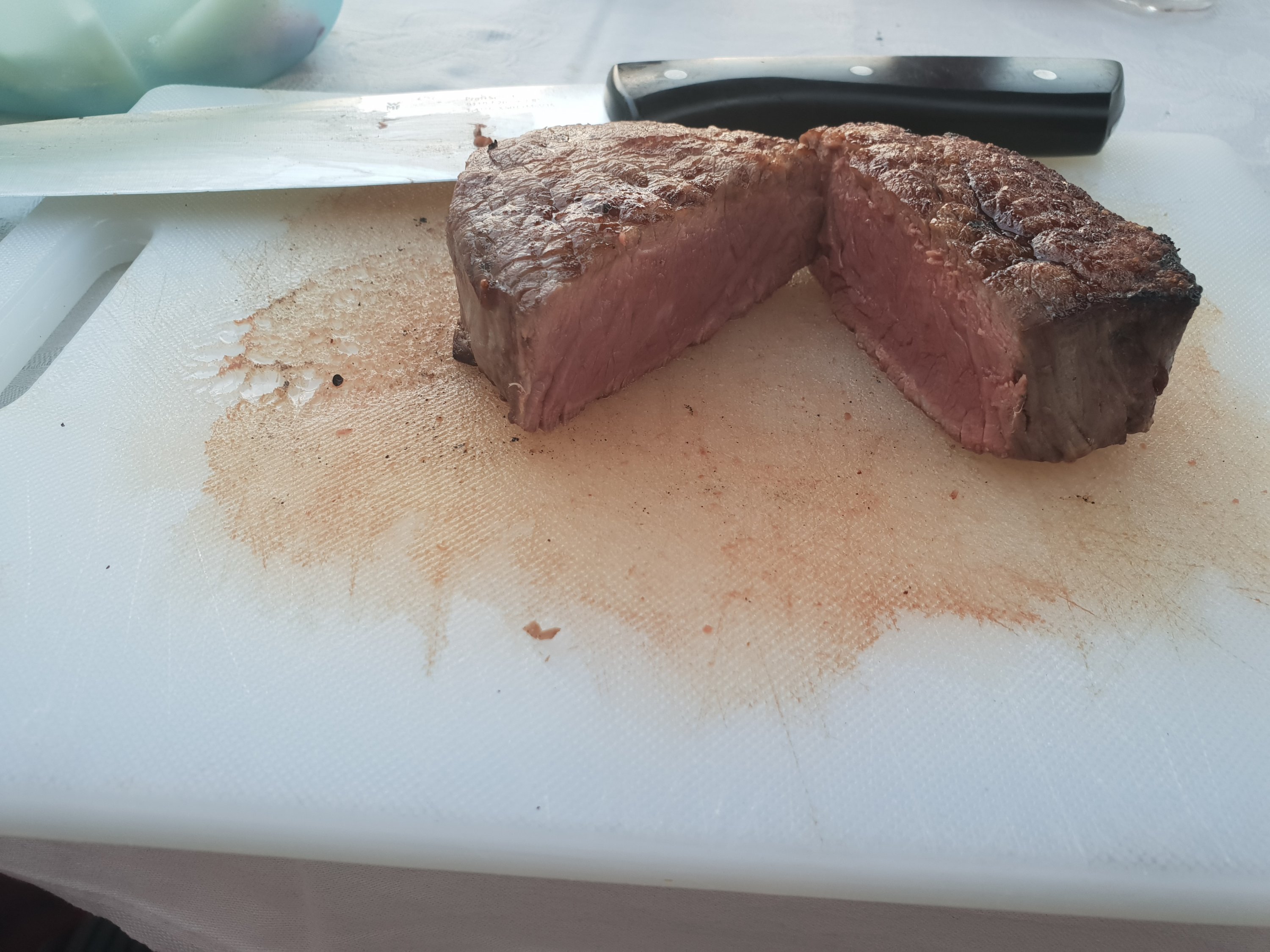 Zur Premiere kam ein Flanksteak und Rinderfilet. Timing ist alles, ich werde wohl noch ein bissel üben müssen.