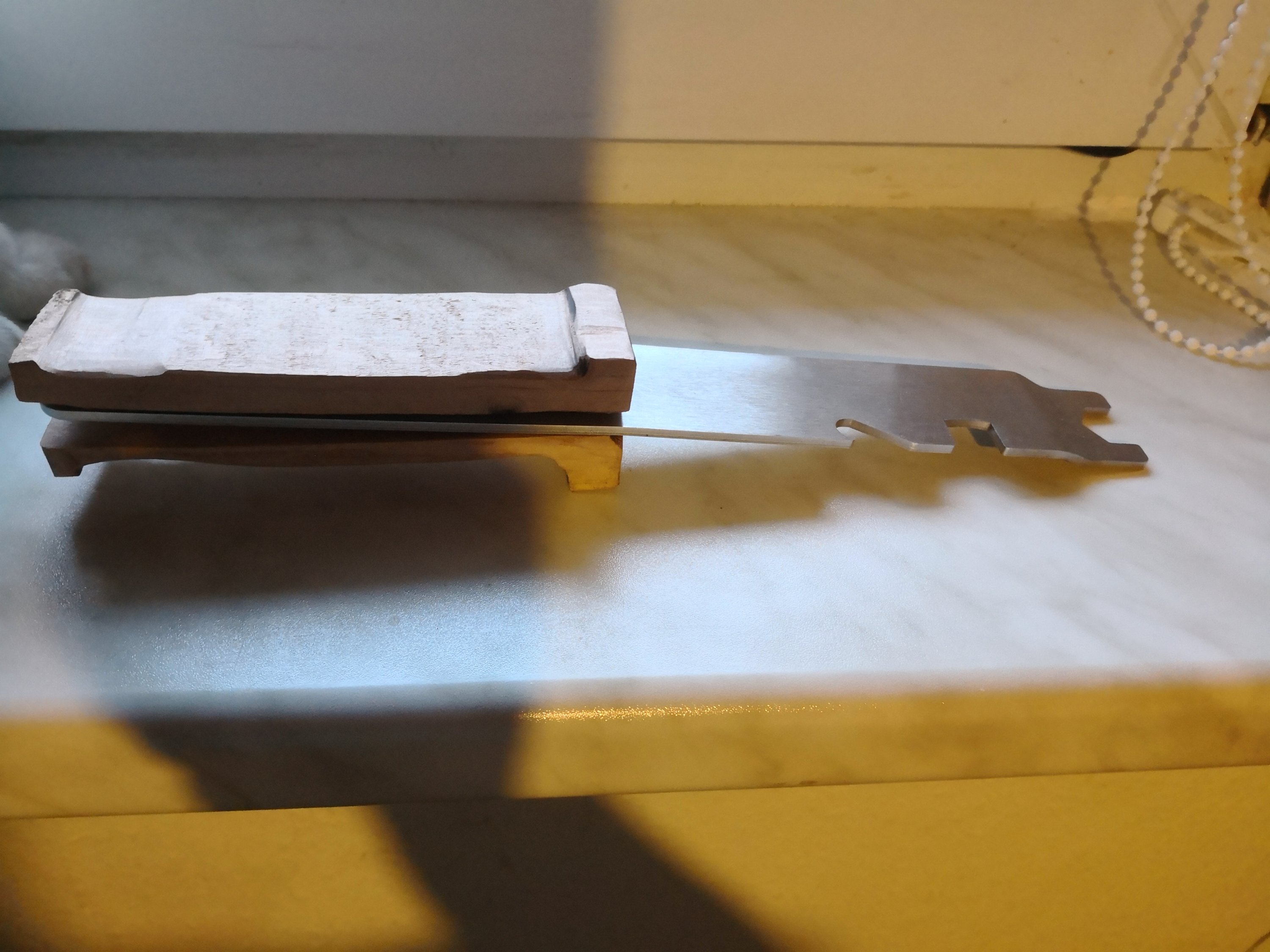 Das ist mit einer stumpfen Schleifscheibe natürlich keine reine Freude, aber es wird. Es geht zwar langsam und da der Heber ja auch etwas viel breiter ist als ein Küchenmesser, muss noch jede Menge abgeschliffen werden. Die beiden Griffhälften sind noch viel zu dick.