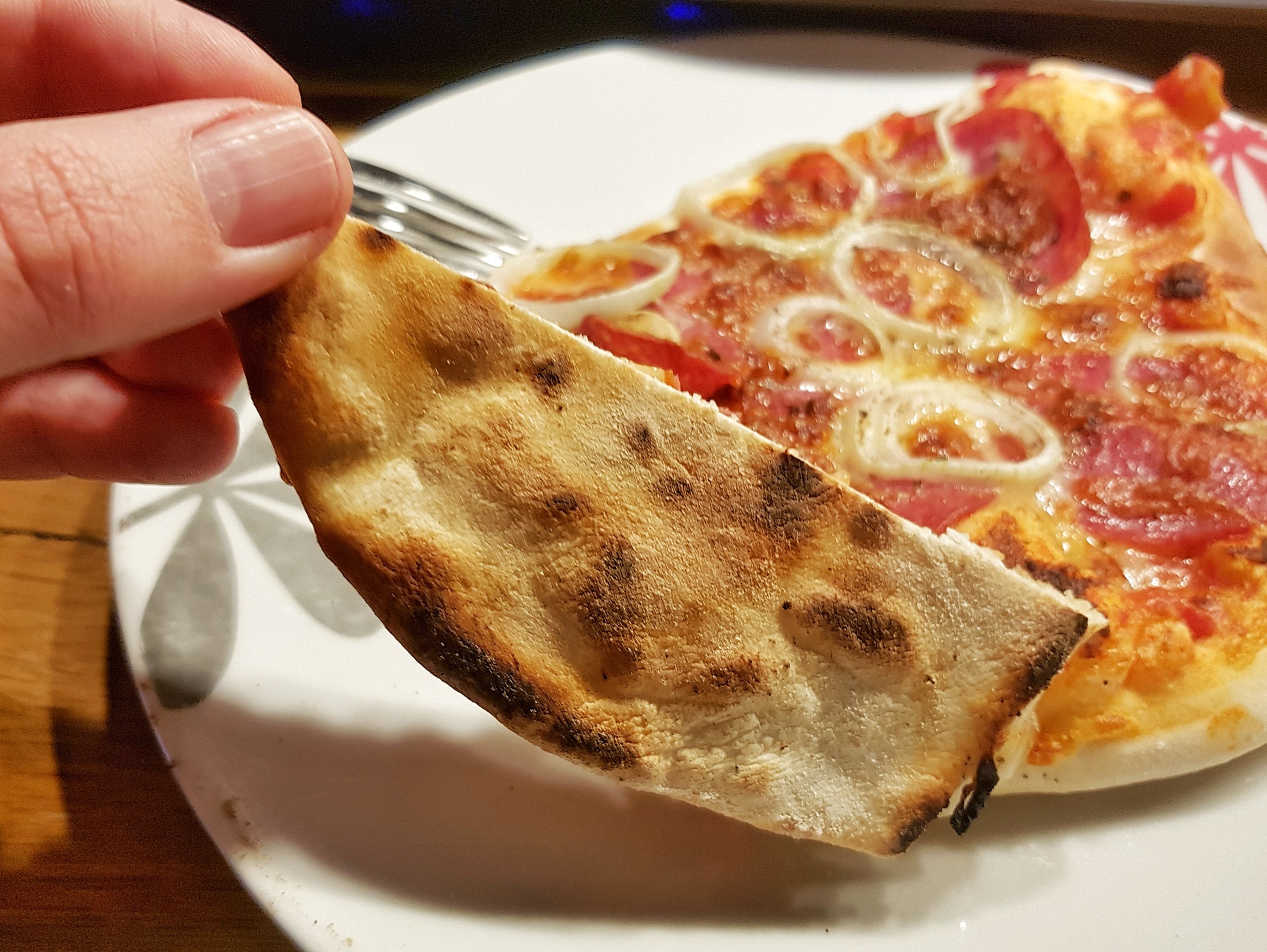 Die Pizza hab ich dann nach Augenmaß gebacken und auch mal kurz um 180° gedreht. Würde sagen nach 3min war sie fertig. Boden war perfekt gebräunt und knusprig. Belag war Top... Ich bin mehr als zufrieden. Die Variante mit dem etwas dickerem Boden hat mir sogar noch einen Ticken besser gefallen.