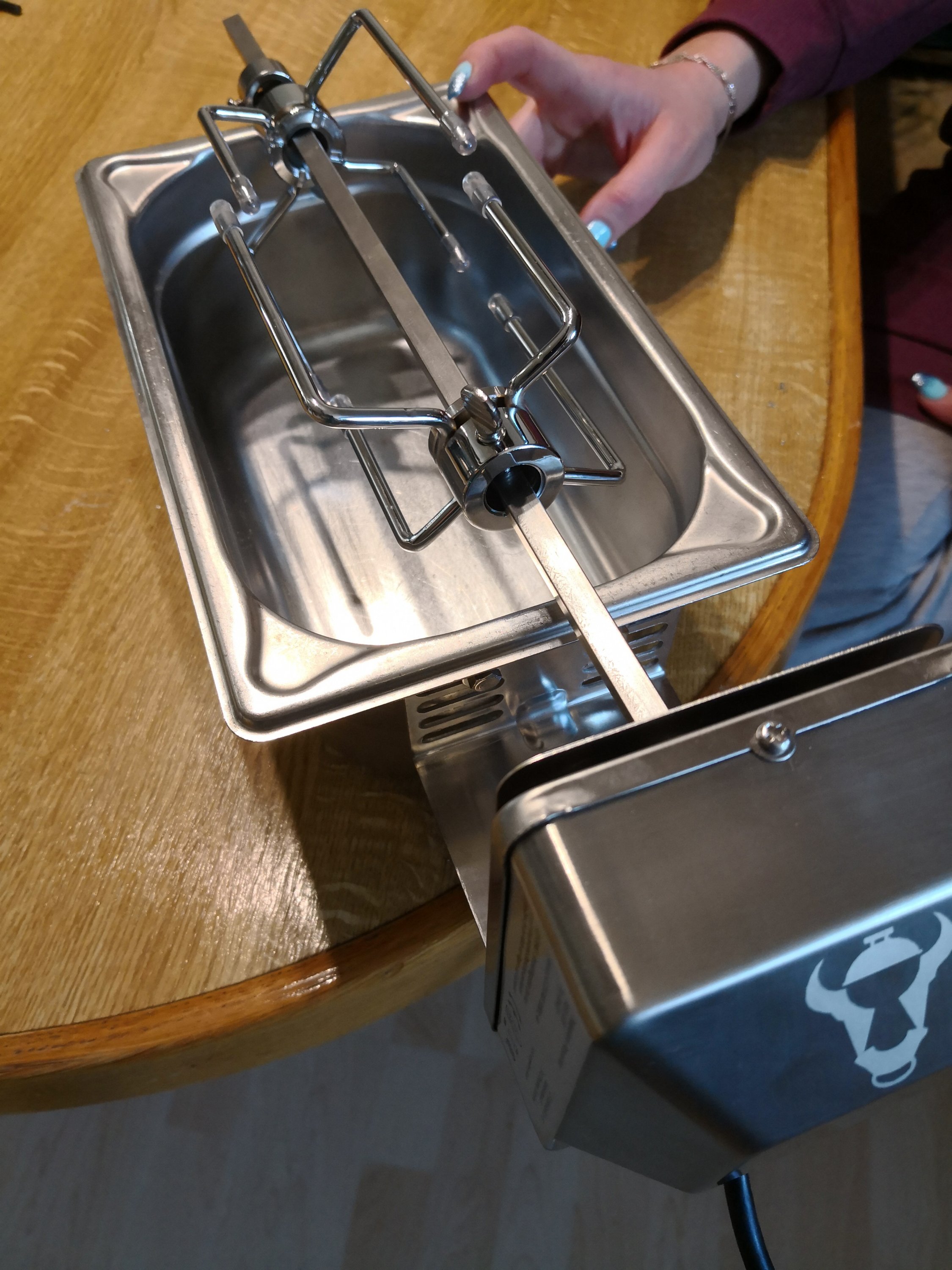 Da die SB ja wohl noch dauern wird, habe ich doch mal selbst Hand angelegt. Erst mal einen Spieß mit Motor gekauft, dann einen 40 cm langen 8x8 Vierkant. Die Halterung für die andere Seite (Rückwand des Single) dauert noch. Aber heute schon mal den Motor fest mit der GN-Schale verbunden. Passt, wackelt und hat Luft.