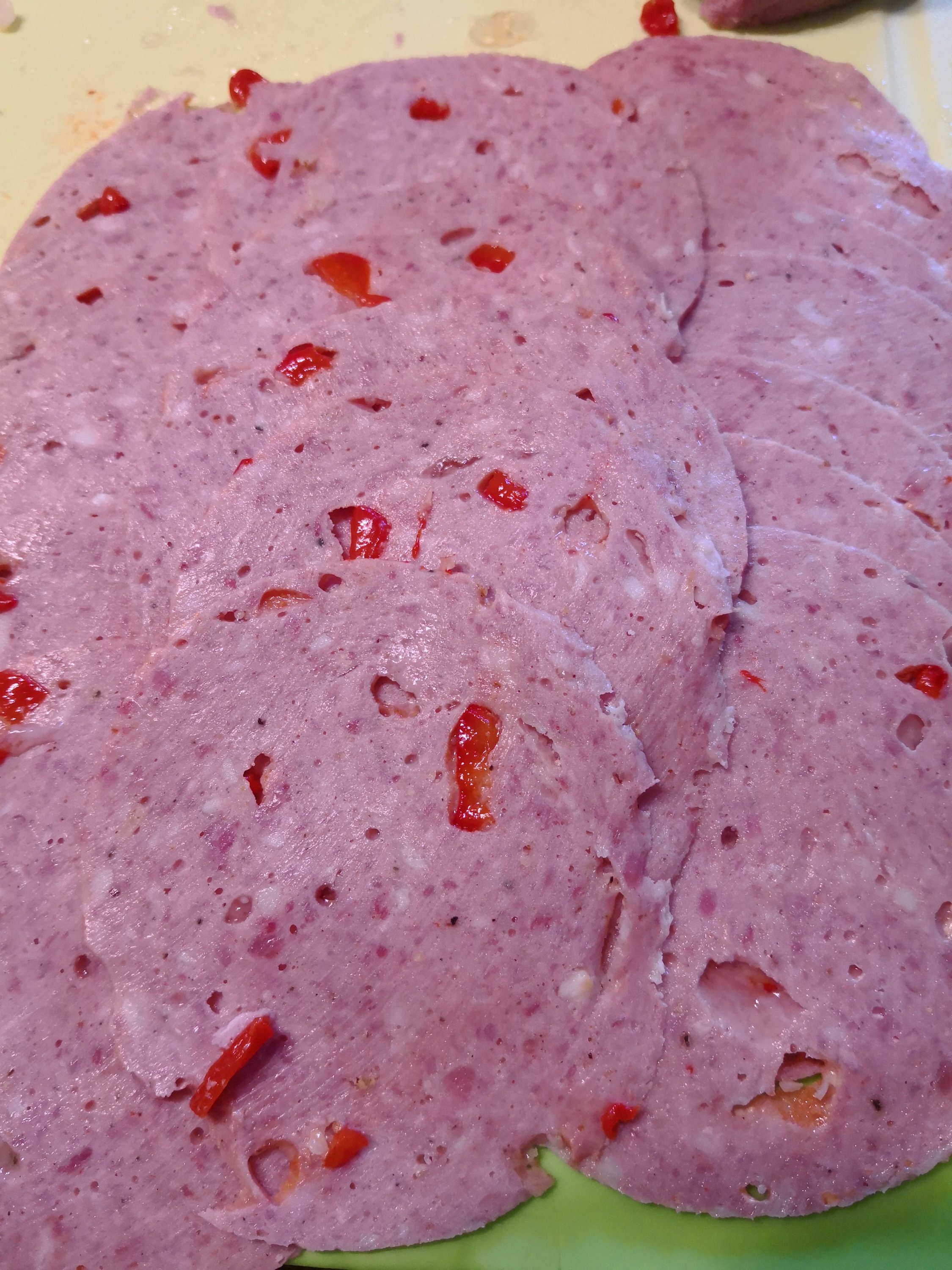 Ich habe die Paprika nur von der Haut befreit mit dem Sparschäler, das ganze dann roh die letzten Minuten mit in der MUM kneten lassen. Ich habe dann das Brät einfach in die MUM geworfen und mit der Hand fest gedrückt (damit möglichst wenig Luft drin bleibt).