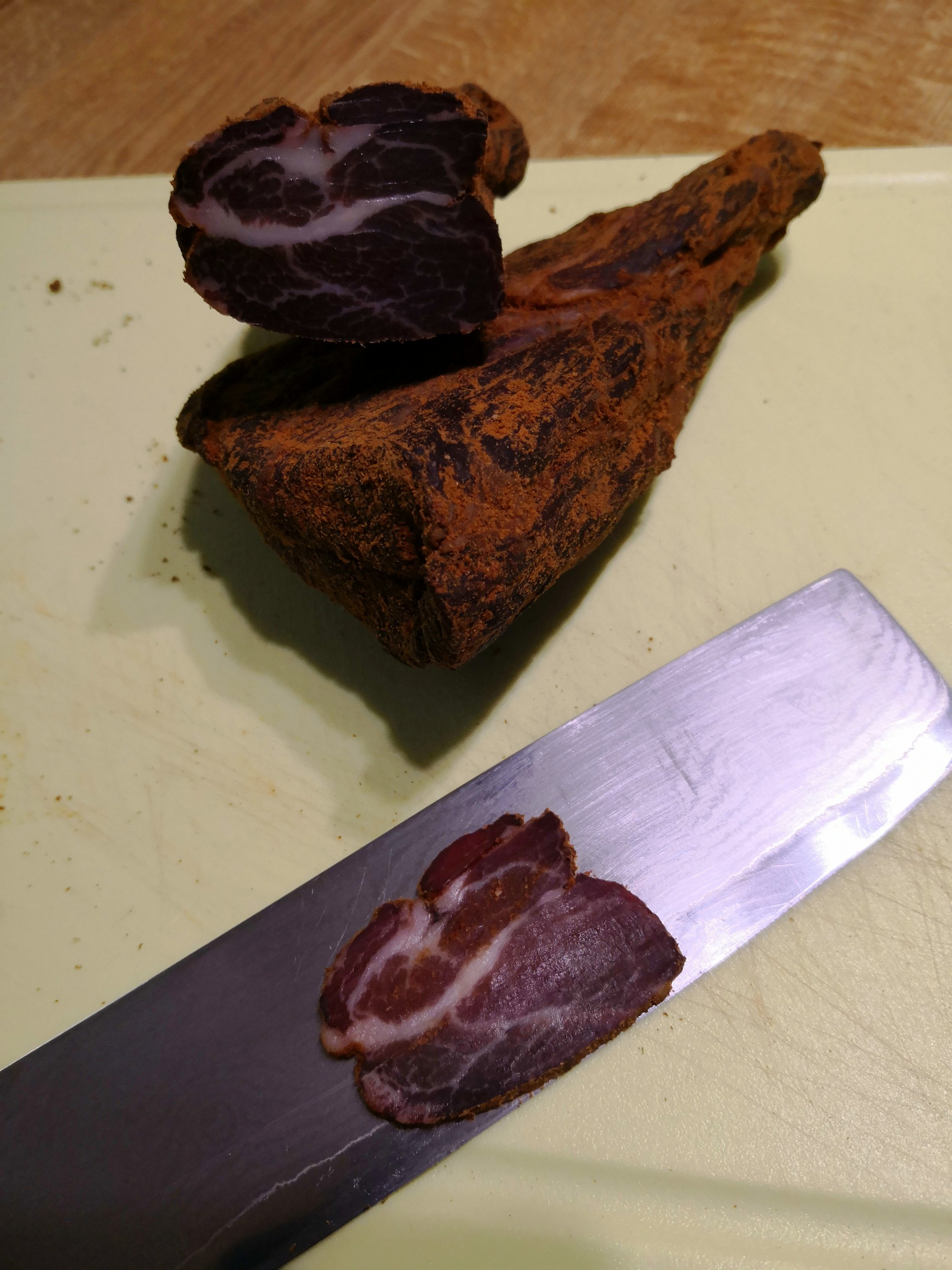Ralphb hat 75% mageren Schweineschinken und 25% Rückenspeck genommen, ich habe 750 g Rinderhack und 250 g grünen Speck genommen.