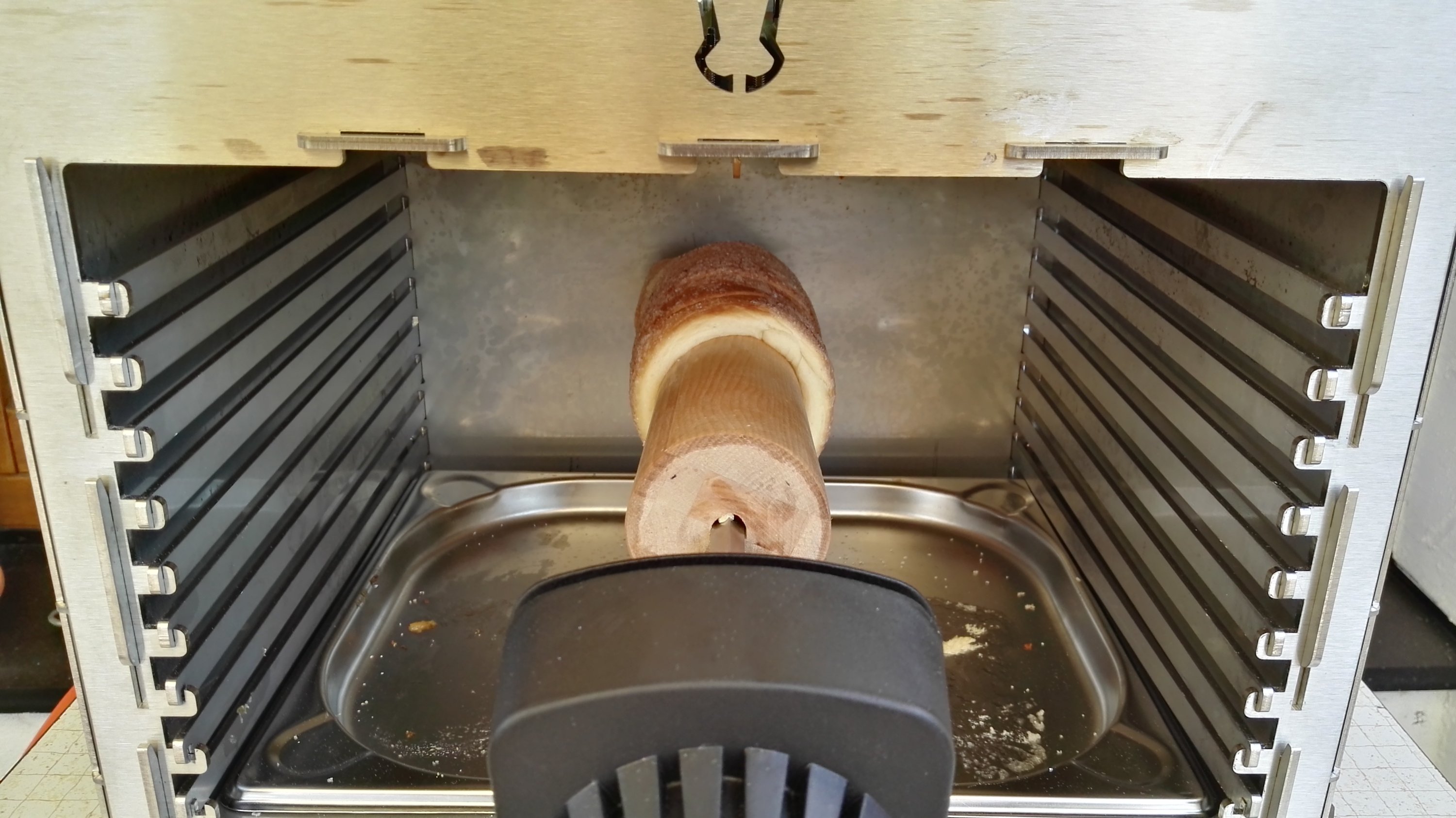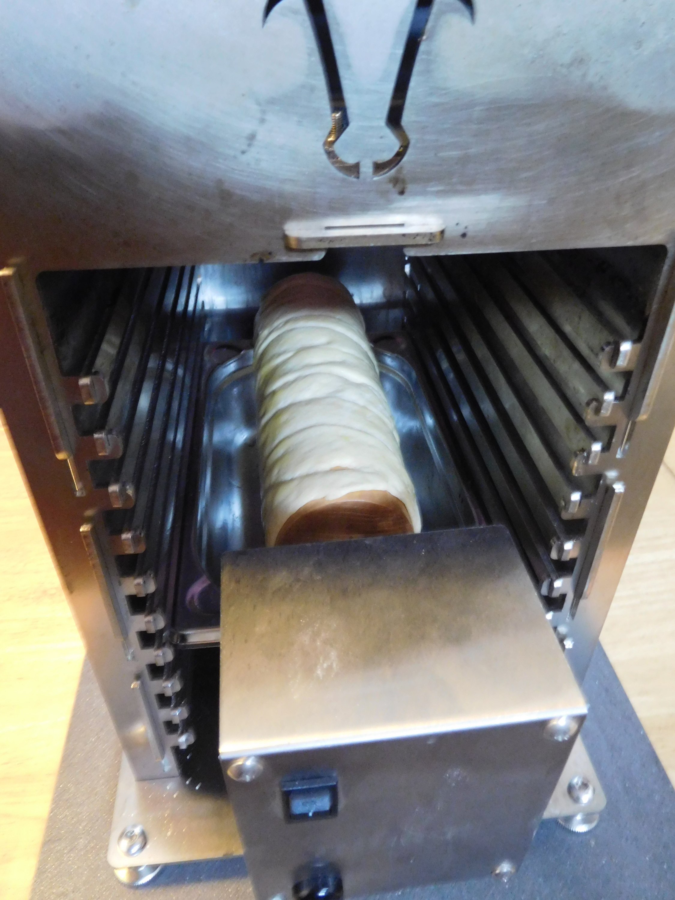 Rauf auf die konisch geschliffene Teigrollen von IKEA und rein in den OHG, nur ein Brenner an auf kleinster Stufe. Roti auf die unterste Einschubmöglichkeit. Ich konnte die Rolle nur zu ca. 2/3 nutzen, da der Teig am vorderen Ende nicht genug HItze abbbekommt.