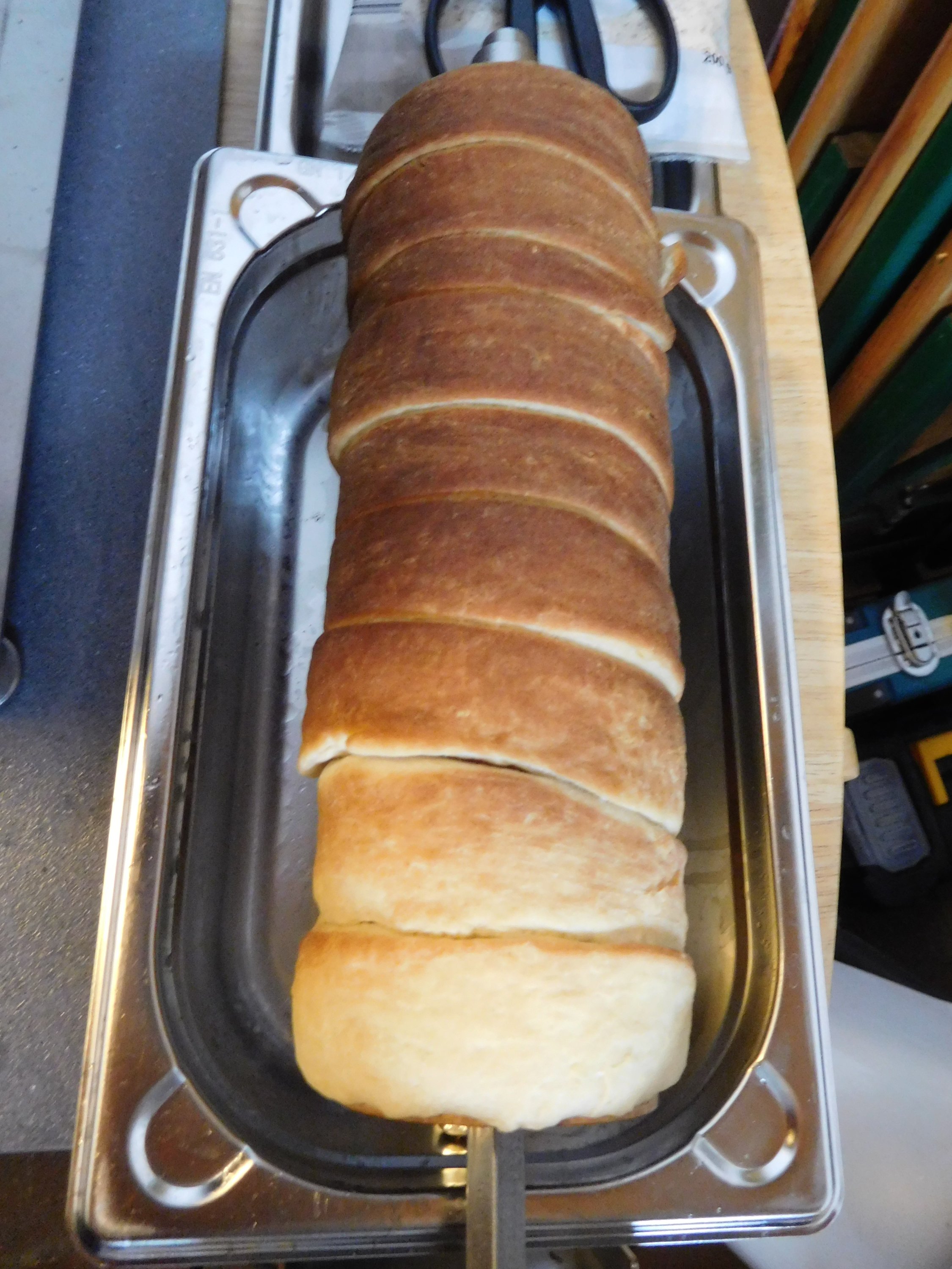 Im Singel hatte ich den Baumkuchen für 12 Minuten, wobei ich ihn vorher, nach 5 Minuten und zum Schluss nochmal mit der zerlassenen Butter eingepinselt habe. An den Bildern kann man schön erkennen, das im vorderen Teil doch die Hitze etwas fehlt, ich werde nächstes Mal etwas weiter hinten anfangen zu wickeln...... ansonsten LECKER......(wir haben dann noch etwas Ahornsirup drüber getan)....