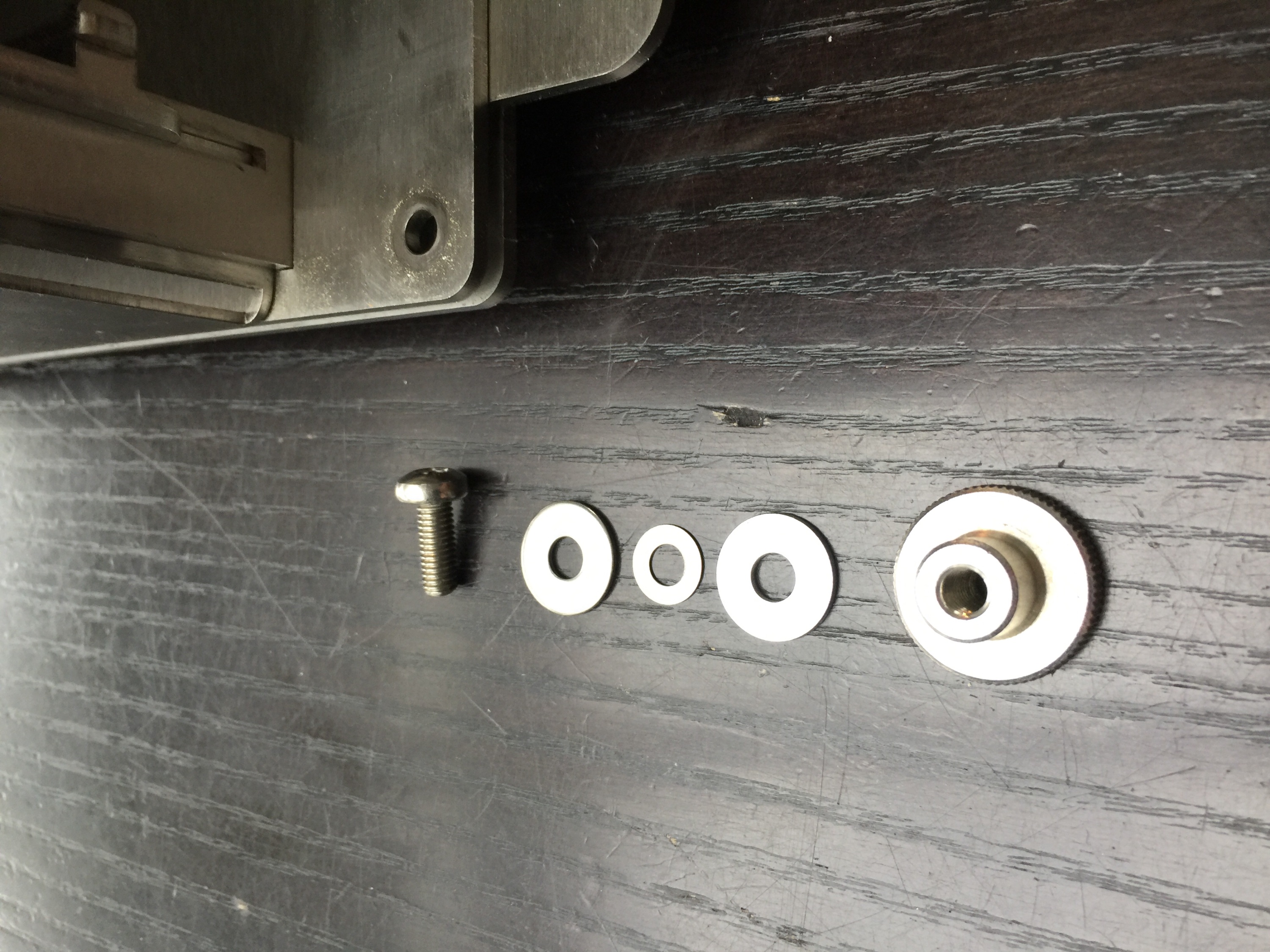 Drei U-Scheiben M6 (Dicke gesamt ca. 3,5mm) und eine etwas längere M6-Schraube: