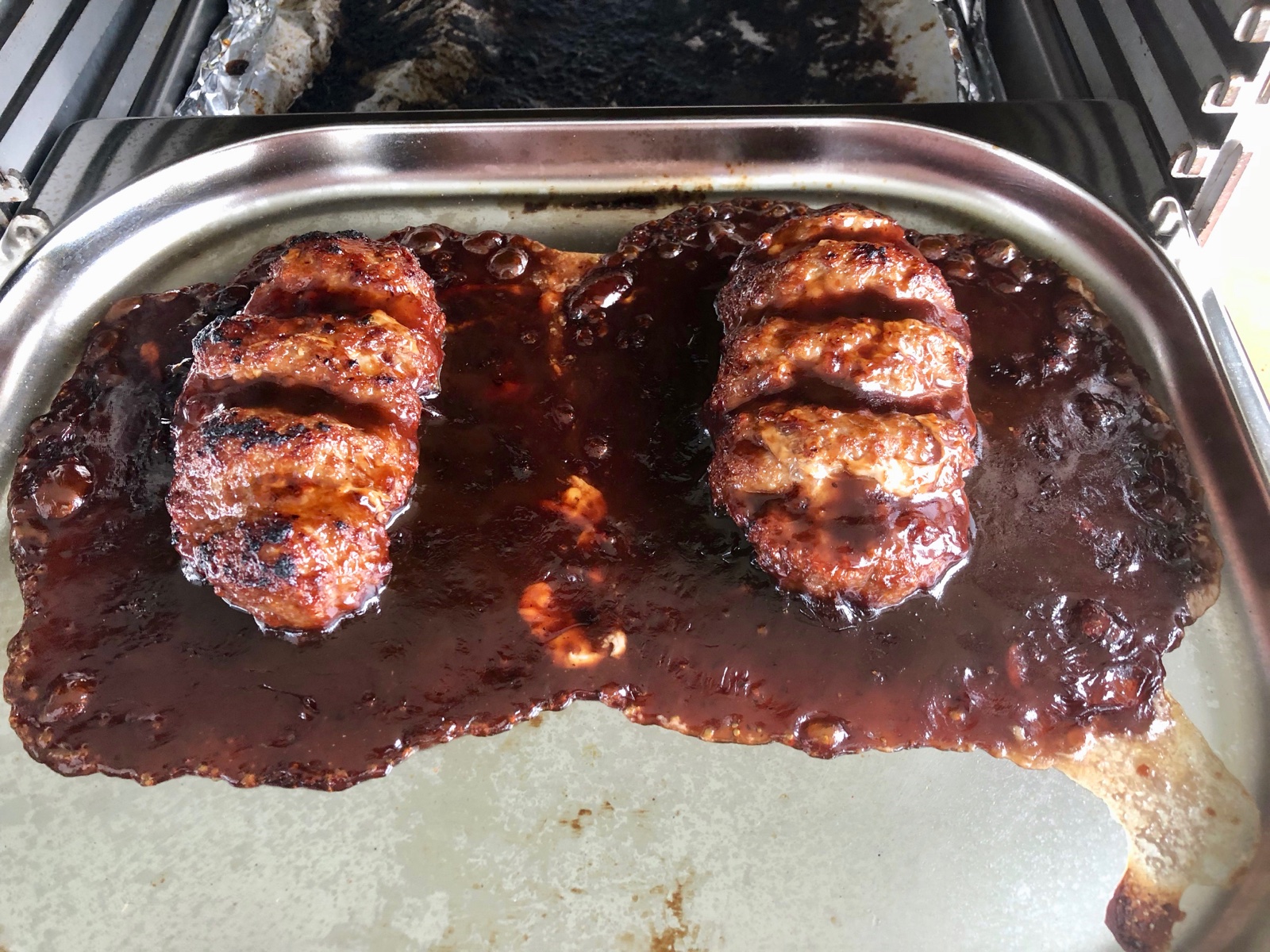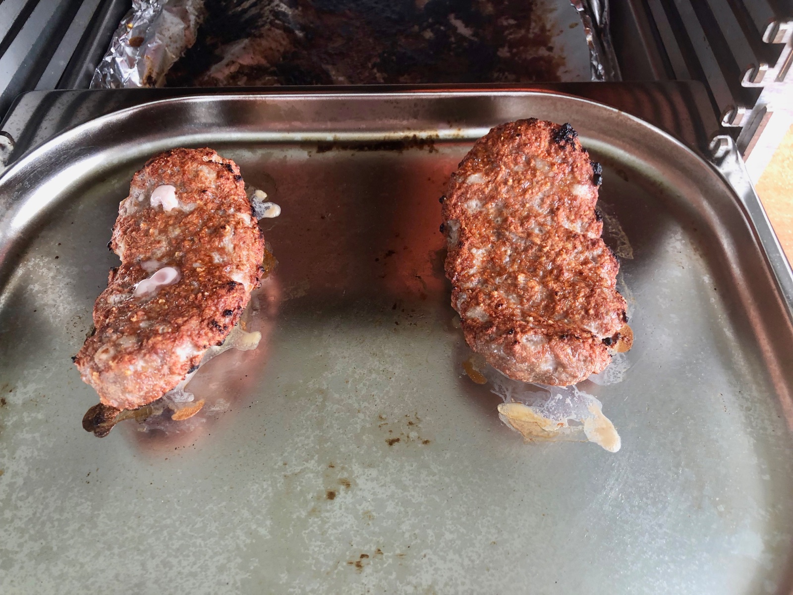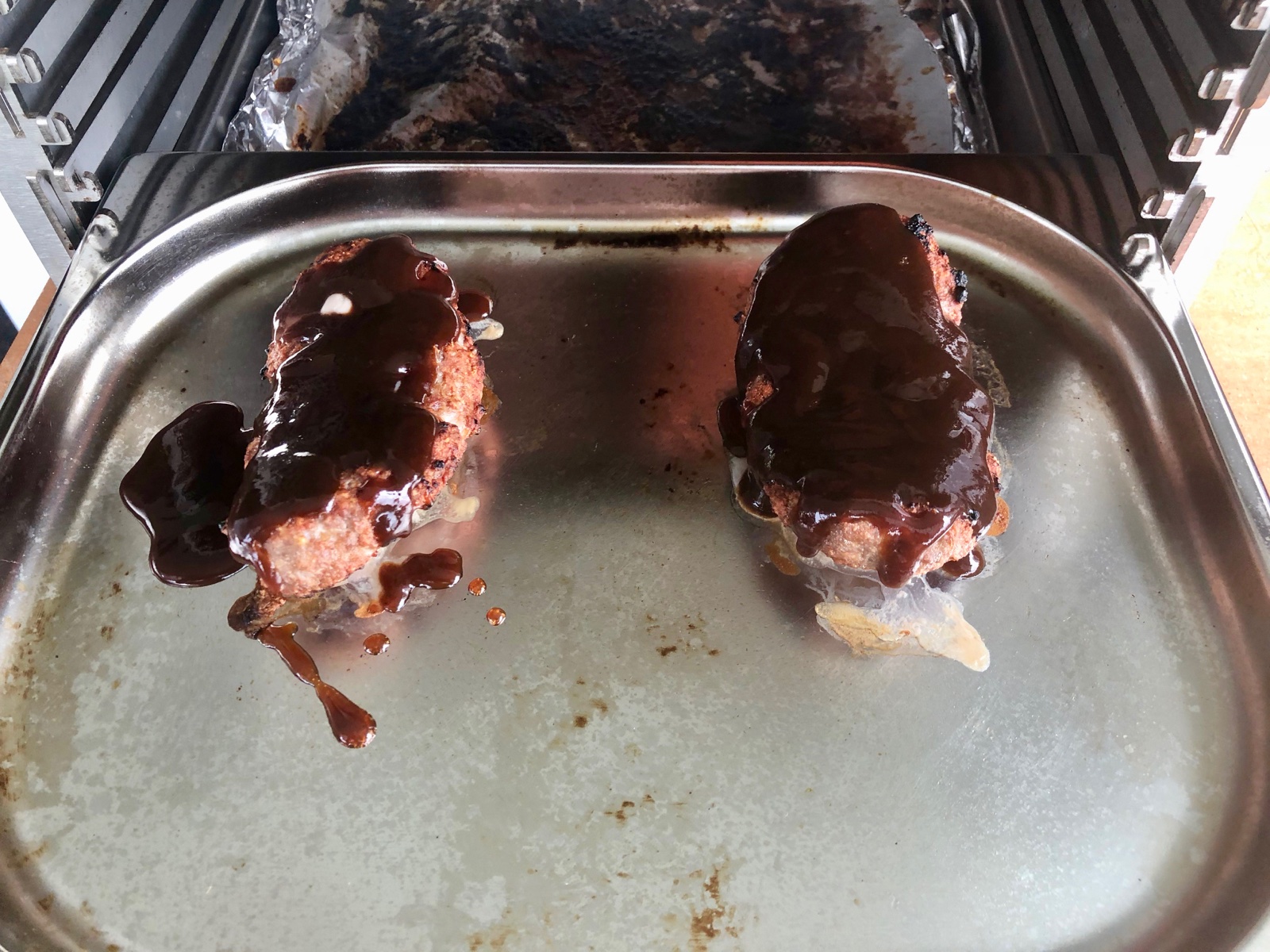 Dann das Ganze auf der 3. Schiene von oben nochmal in den Grill schieben und so die Patties für einen Moment in der Sauce kochen lassen. Das Ergebnis sieht dann so aus: