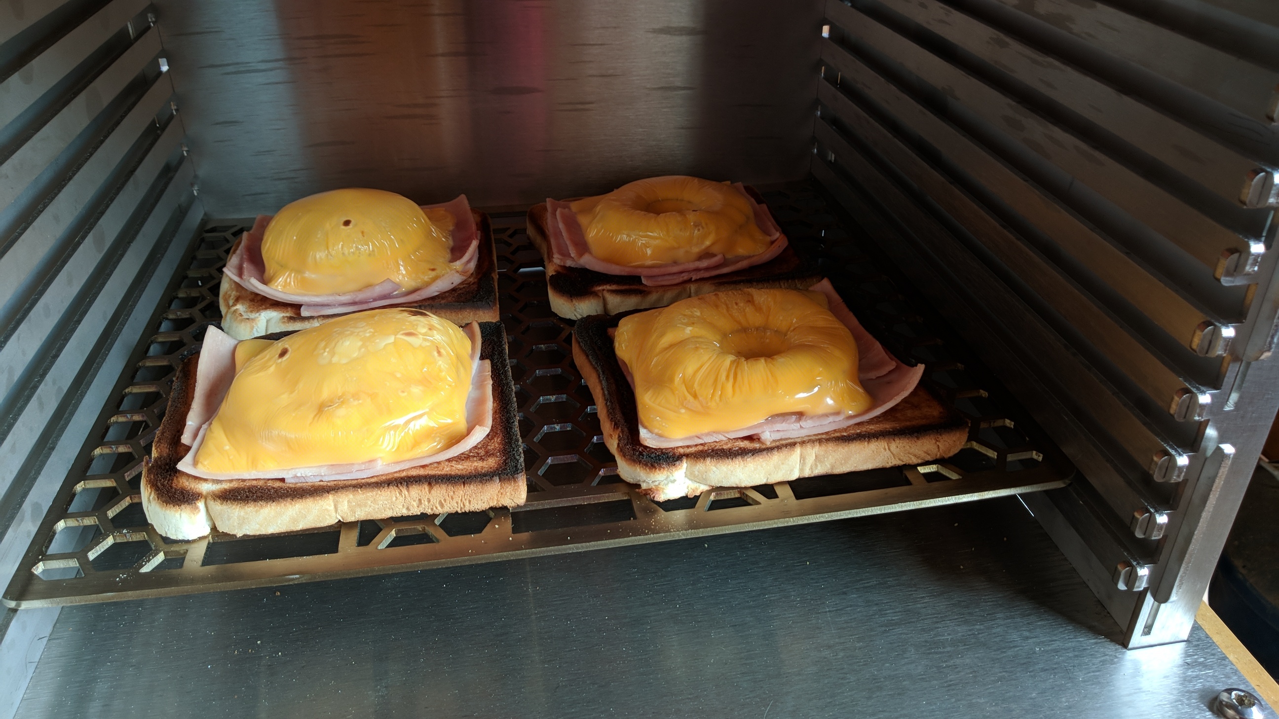 Toast im Grill von beiden Seiten "getoastet" , belegt und dann bei Drittel Hitze fertig gestellt.