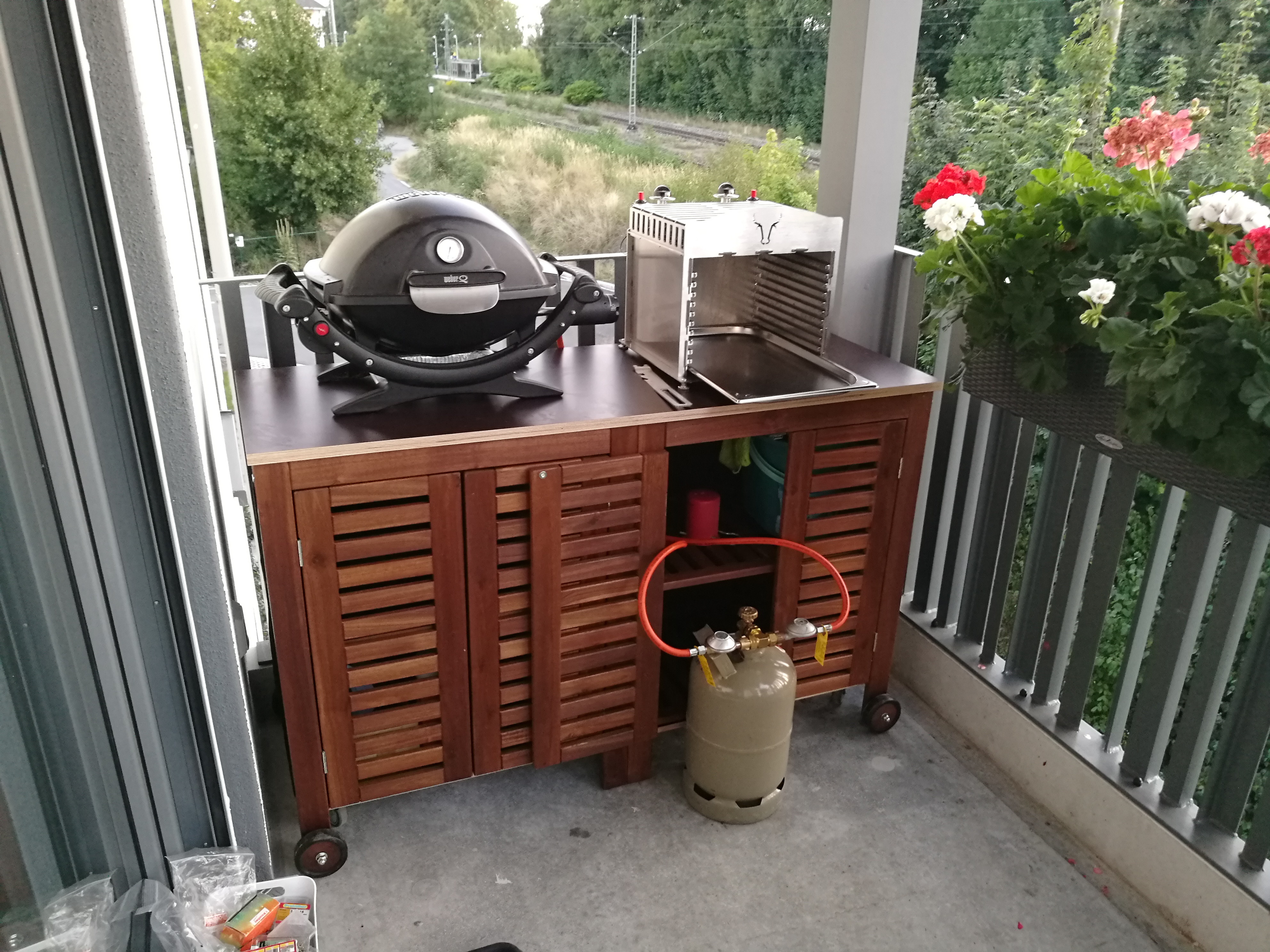 nachdem gerade der Bau meines Grillplatzes stagniert, hier mein aktueller Zwischenstand. Besteht aus 2 IKEA Äpplarö, die ich ohne Tischplatte gekauft habe. Kosten dann 99€ das Stück. Habe beide zusammengeschraubt und mit einer gemeinsamen Bodenplatte verbunden. Diese hat zusätzlich noch drehbare Rollen drunter, so dass man das Ungetüm halbwegs bewegen kann. Den Stoff auf der Rückseite habe ich durch eine gemeinsame Rückwand aus dünner Betonschalplatte ersetzt. Stattdessen ist die Stoffbespannung von innen an die Türen getackert und soll so Verstaubung verhindern. Die Seiten sind ebenfalls mit Betonschalplatte, diesmal jedoch zusätzlich zum Stoff dicht gemacht.