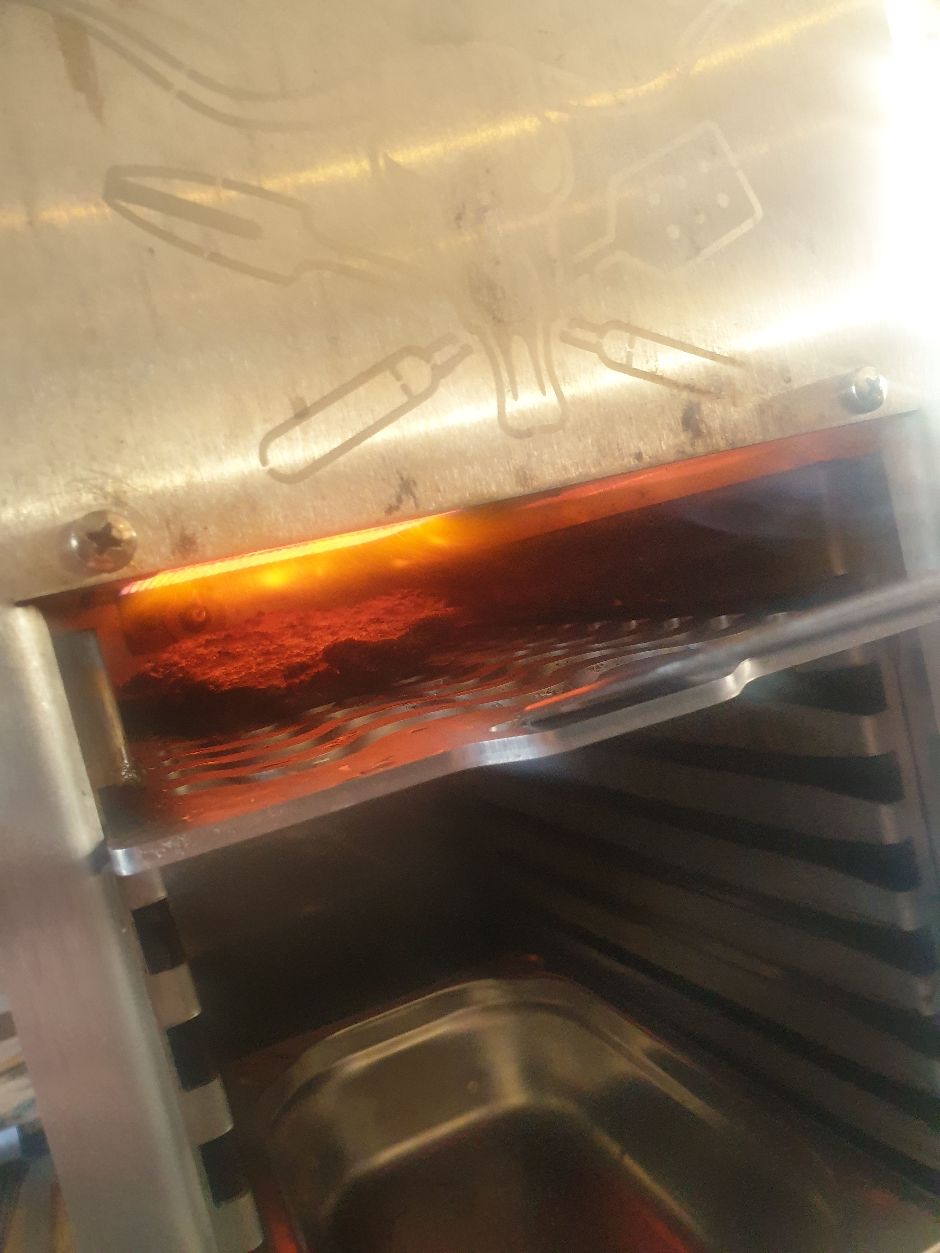 Mein Grill Hat ein bläuliches Flammenmeer im Innenraum. Mir kommt es so vor als wenn er gar nicht So extreme Temperaturen erreicht. Bei dem Foto war der Grill schon eine Std. an, haben Pizza ausprobiert, die dauerten aber auf Vollgas trotzdem 3-4 Minuten ( vorletzte Schiene unten ).