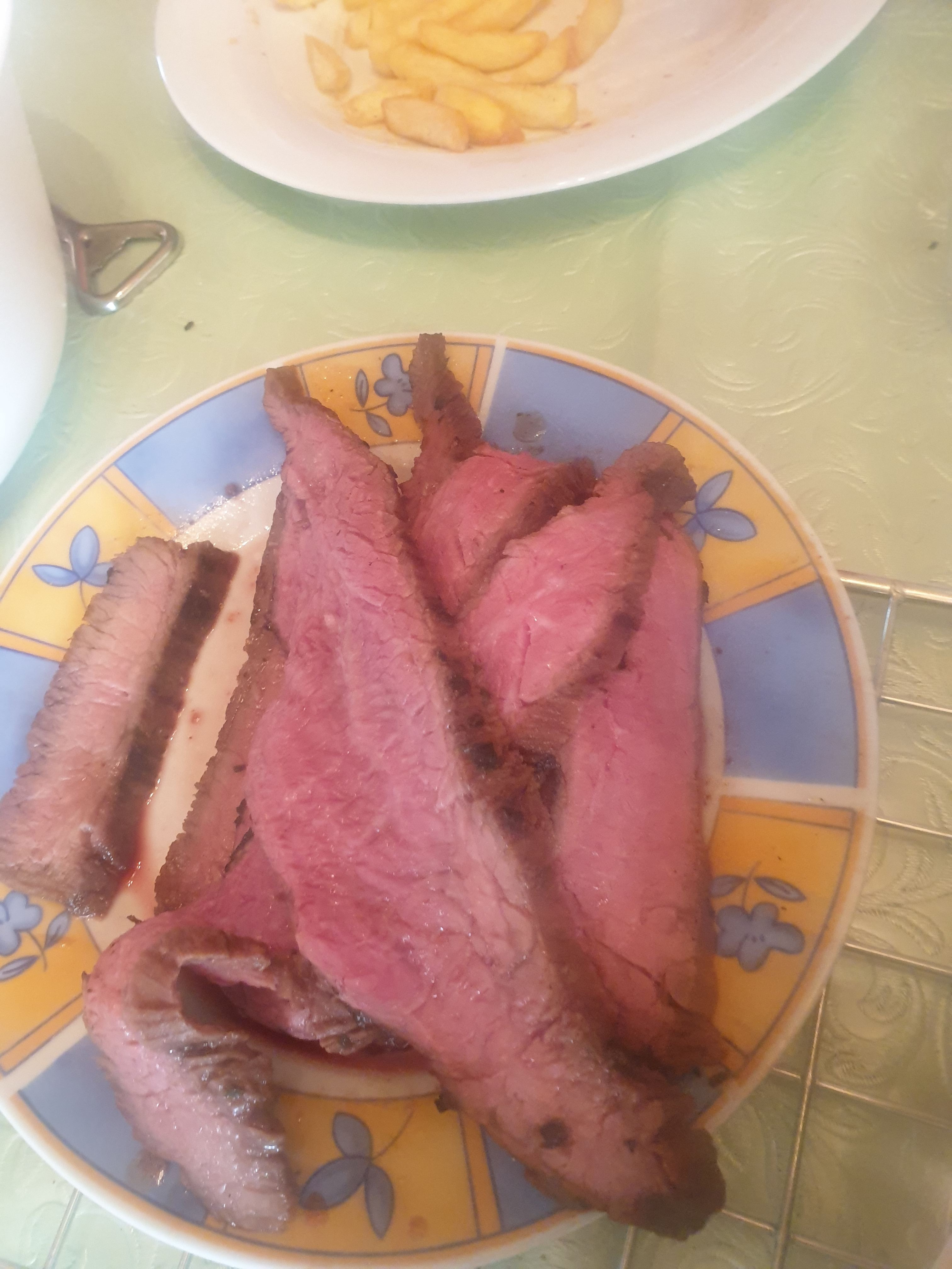 Es waren 2 Flank Steaks. Das erste war leider etwas zu weit, wie man sieht. Das zweite hat schon deutlich besser geklappt.