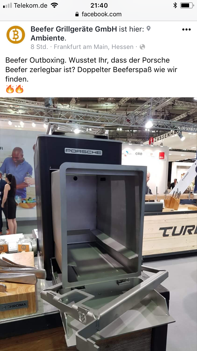 Jedenfalls scheinen sie das Verstellmechanismus überarbeitet zu haben. Als ich beim ersten Beeffer links und rechts die Schlitze gesehen habe, habe ich mich gefragt, warum sie nicht darauf verzichten und mit dem Mechanusmus von vorn rein gehen. Das scheint bei dem Porsche so gelöst zu sein. Wenn sich das ganze noch abnehmen lässt, hat der Garraum keine seitlichen Öffnungen mehr, in die Fett fließen kann. Das Gerät sieht hochwertig und teuer aus.